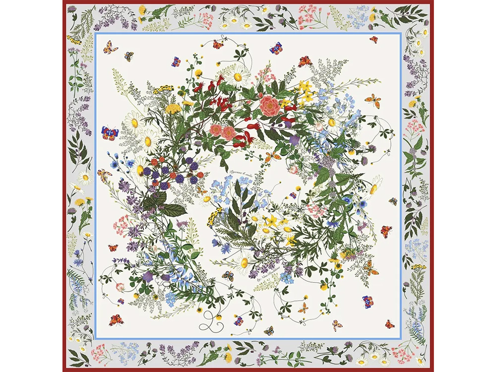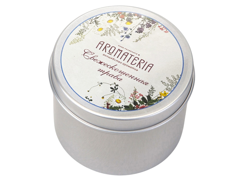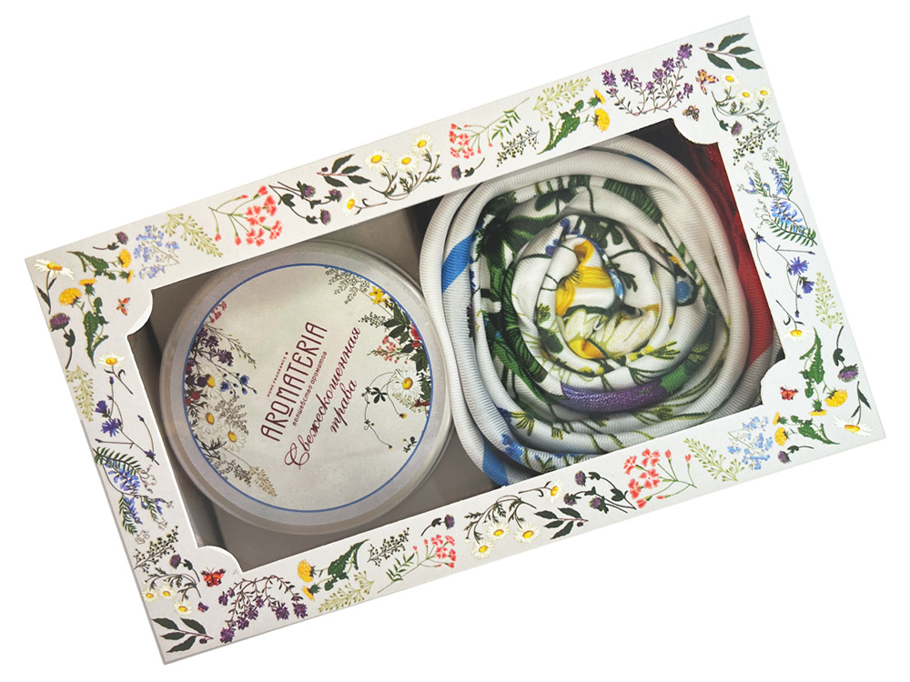 Набор состоит из платка Русский полевой букет от бренда Русские в моде и ароматической свечи Ароматные травы от AROMATERIA. -
