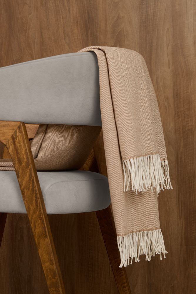 Классический рисунок «елочка» не слишком привлекает внимание, но в то же время добавляет изюминки. Смешанный состав пряжи продлевает срок службы и существенно облегчает уход за пледом.