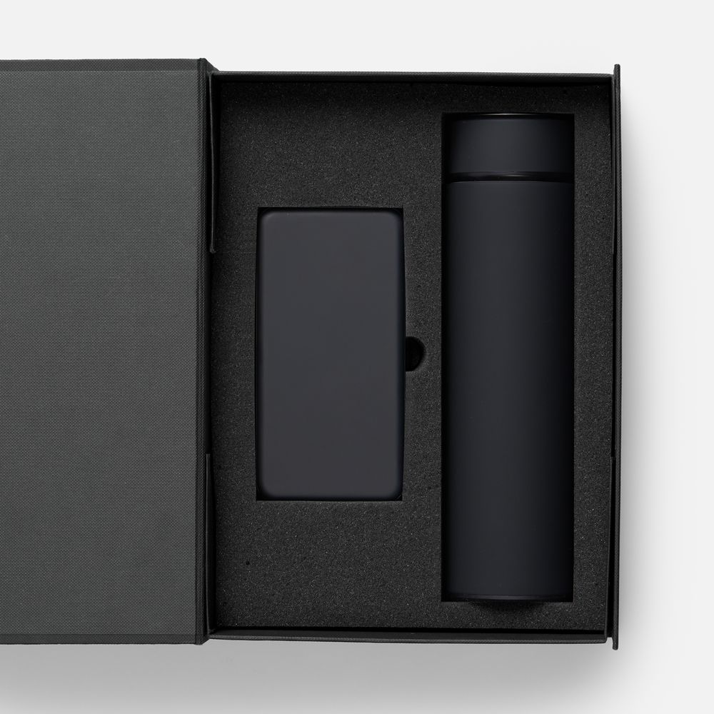 аккумулятор - пластик; покрытие софт-тач; термос - нержавеющая сталь, 304; покрытие софт-тач; коробка - переплетный картон
