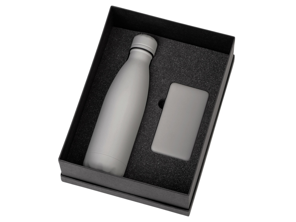 повербанк- пластик с покрытием софт-тач, термобутылка- нержавеющая cталь с покрытием софт-тач