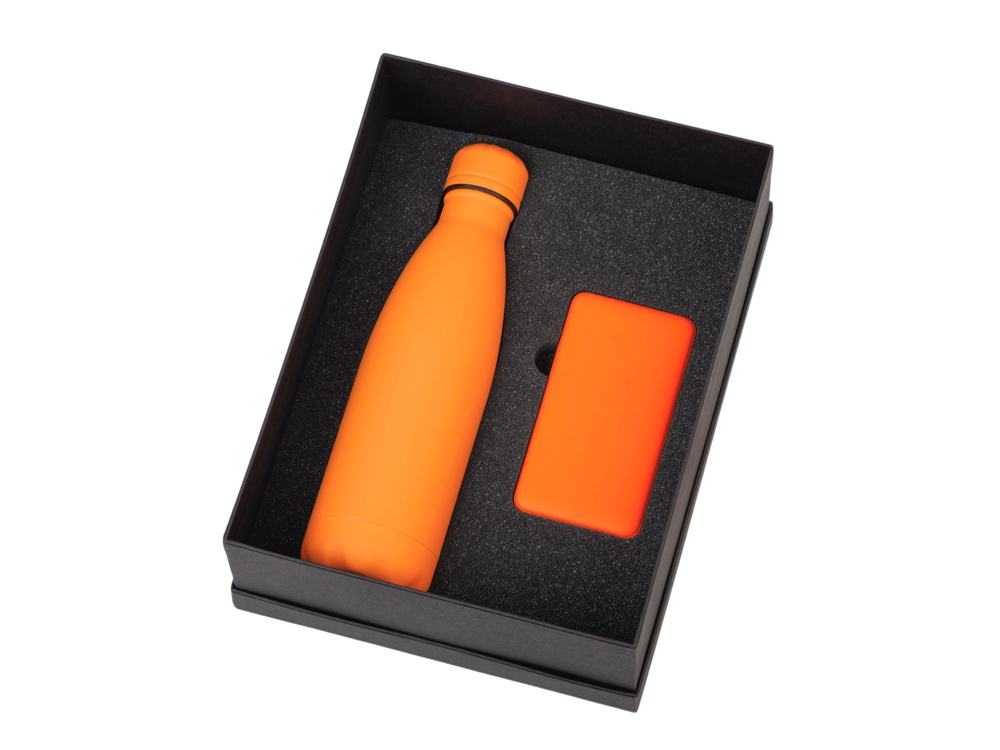 повербанк- пластик с покрытием софт-тач, термобутылка- нержавеющая cталь с покрытием софт-тач