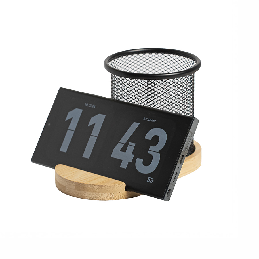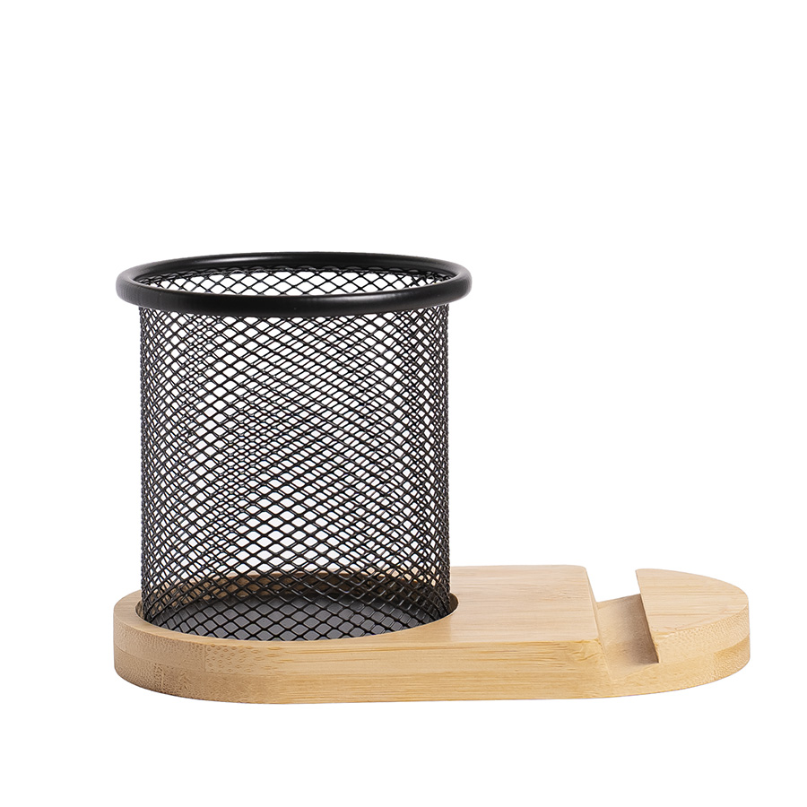 Как правило, на рабочем столе нам всегда не хватает места, т.к. каждый из однофункциональных предметов претендует на полезную площадь. Вашему вниманию предлагается дуэт, в котором объединены 2 функции. Это подставка для телефона из бамбука и металлический стакан-подставка под пишущие принадлежности. Комплект изготовлен из природных материалов. Позволяет организовать свое рабочее пространство стильно и компактно. • Размер подставки: 16,5 х 9,5 х 1,7 см• Размер выемки для гаджета 13 мм• Размер стакана под пишущие принадлежности: 8,5 х 8,5 х 9,5 см -
