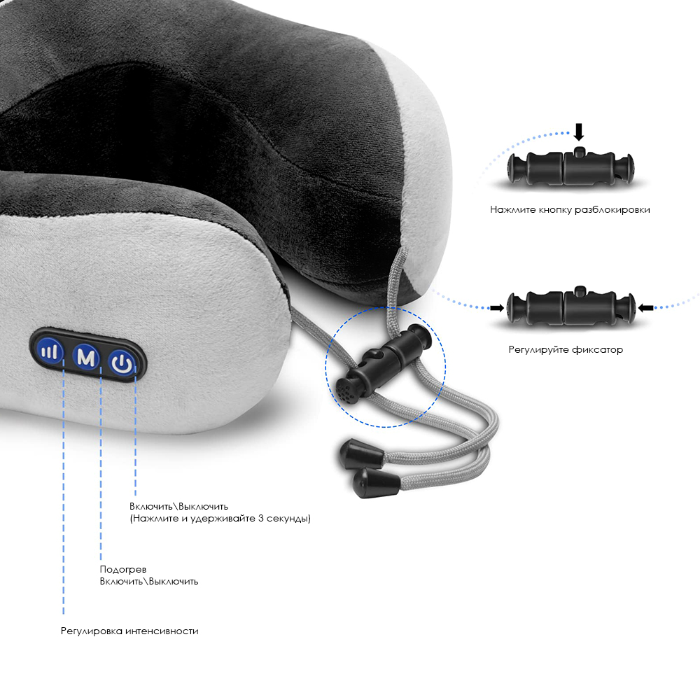 Погрузитесь в состояние полного покоя с инновационной массажной подушкой Zen, созданной для тех, кто ценит комфорт, заботу о себе и свободу движения. Это не просто аксессуар для путешествий — это ваш персональный массажист, который всегда под рукой. Zen сочетает в себе функции массажа, подогрева и эргономичной поддержки шеи, превращая каждую минуту отдыха в полноценную терапию. Благодаря встроенной аккумуляторной батарее и возможности зарядки от внешнего источника, вы получаете свободу использовать подушку где угодно — в самолёте, автомобиле, офисе или дома. Подушка имеет встроенный аккумулятор емкостью 800mAh, что позволяет использовать функцию массажа от батареи около 2-ух часов. Zen можно заряжать даже от внешнего аккумулятора, время зарядки батареи - 3~4 часа. В комплект входит: массажная подушка, зарядный кабель USB-A - Type-C
