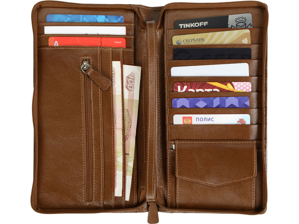 Стильное трэвел-портмоне из натуральной кожи позволит организоват хранение визитных и пластиковых карт. В портмоне предусмотрены карманы под купюры. Портмоне прекрасно подойдет для подарка женщинам и мужчинам. -