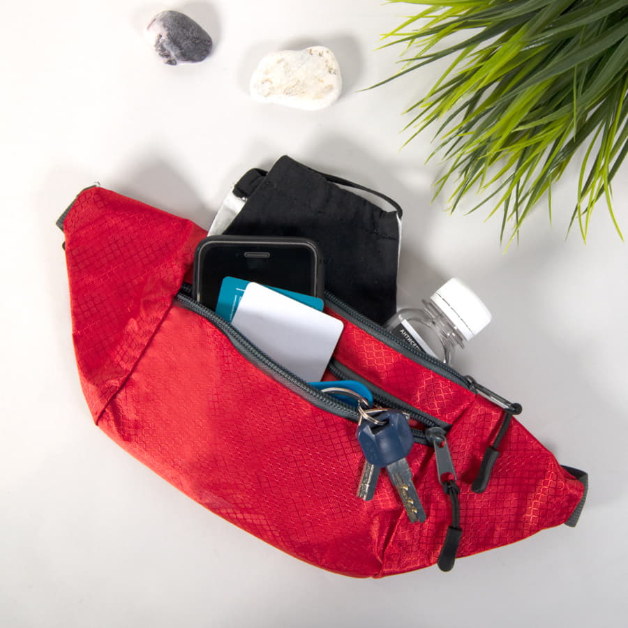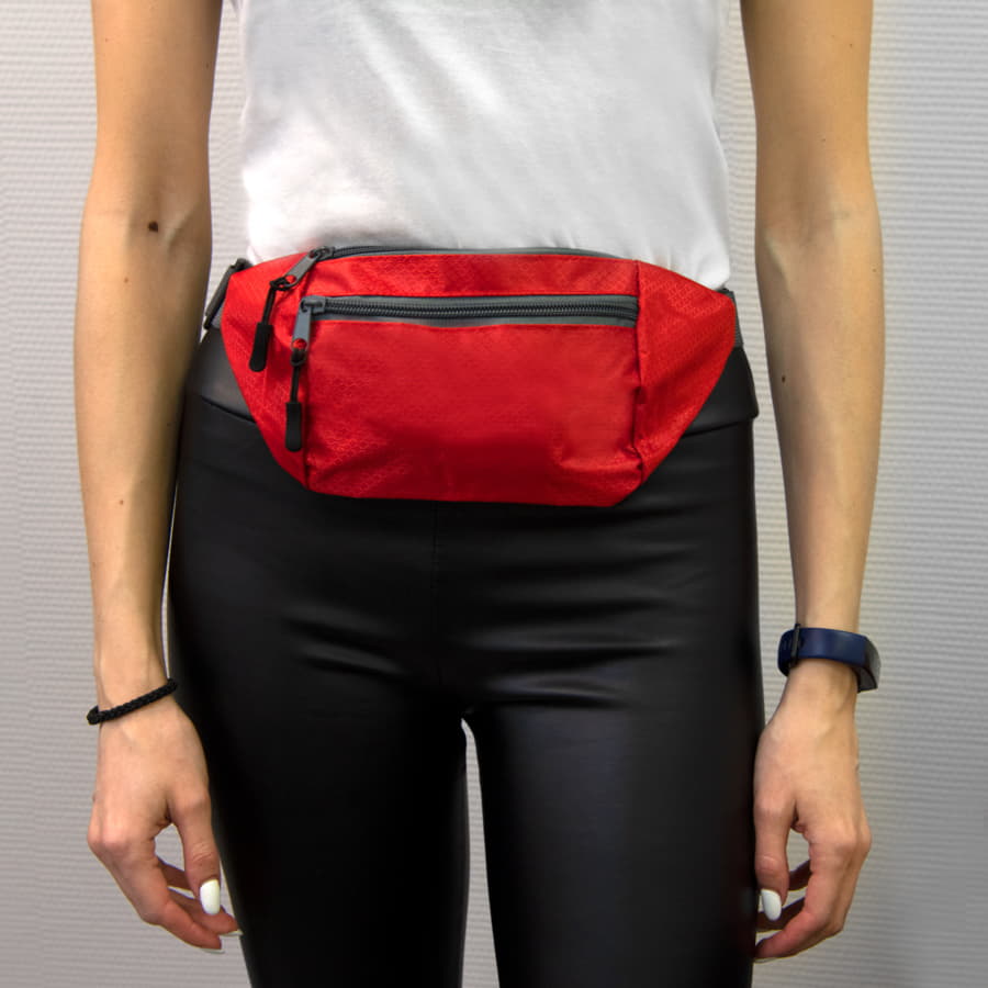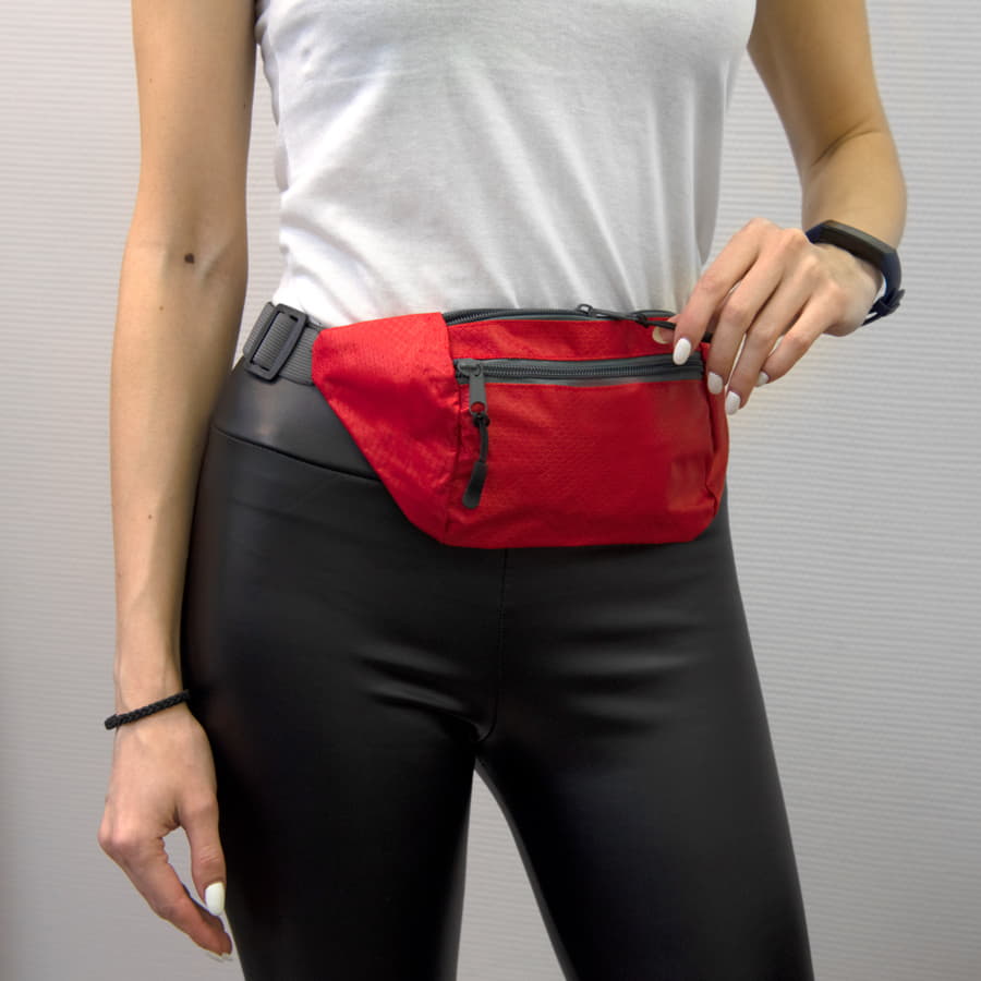 Поясная сумка из интересного материала рипстоп отлично подойдет для прогулок или занятий на свежем воздухе. Рипсто́п (от англ. ripstop) — тип ткани, в структуре которого использована упрочнённая армированная нить из нейлона. Сумки из такого материала прочные, но легкие, с интересным дизайном поверхности материала, напоминающим медовые соты. Сумка с двумя отделами на молнии для удобства хранения небольших, но важных вещей. Крепится на регулируемую широкую стропу с пластиковой застежкой. Упакована сумка в прозрачный пакет -