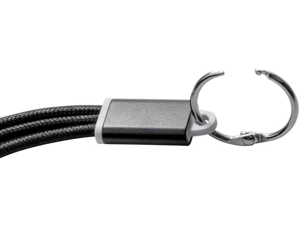 Кабель для зарядки Tres 3-в-1 с брелоком, коннекторами 1 type с, 1 USB type A и двойным совместимым коннектором 2-в-1 для устройств с ОС Apple® iOS и Android. В комплект входит брелок. Для зарядки устройств Apple подключайте кабель стороной без контактов; для зарядки устройств с ОС Android подключайте кабель стороной с контактами. Алюминий. -