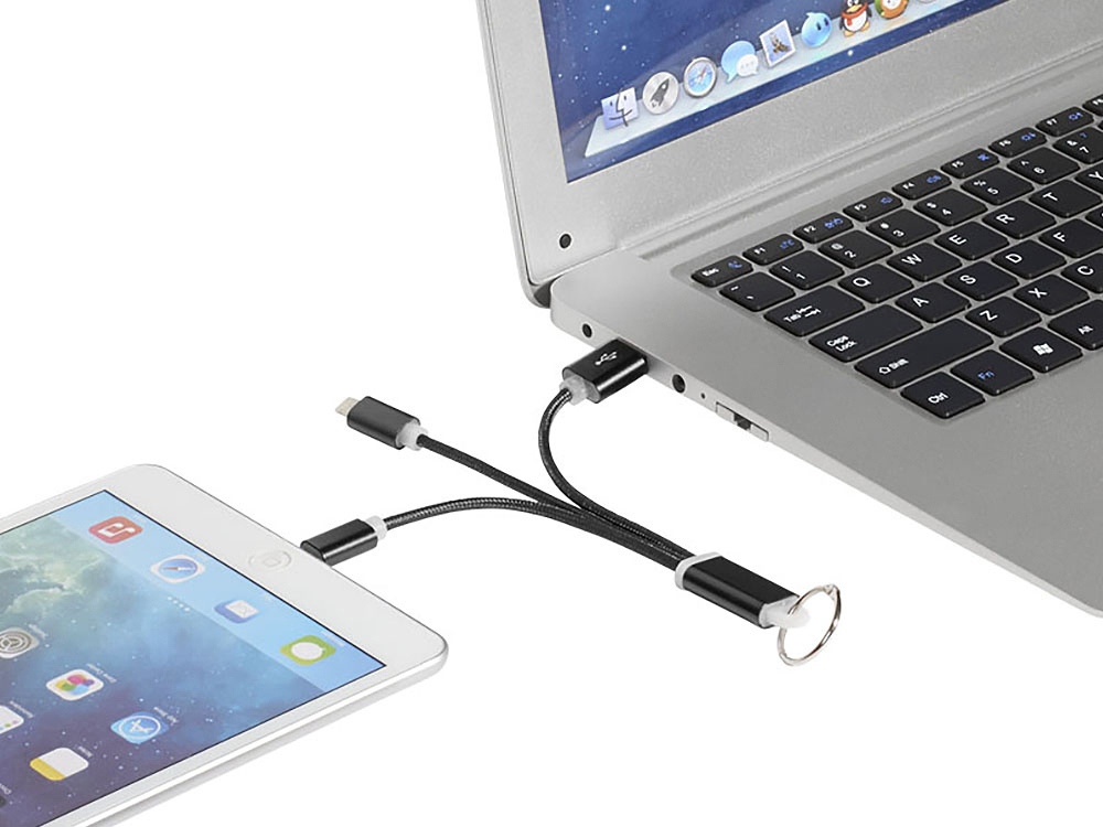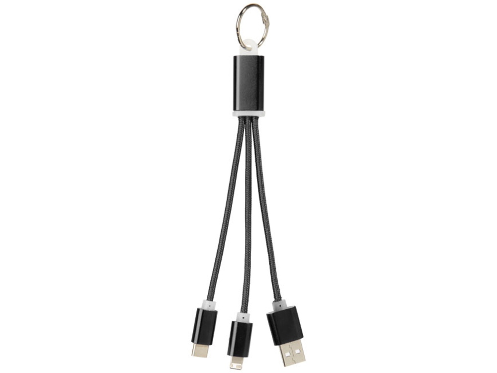 Кабель для зарядки Metal 3-в-1 с брелоком, коннекторами 1 type с, 1 USB type A и двойным совместимым коннектором 2-в-1 для устройств с ОС Apple® iOS и Android. В комплект входит брелок. Для зарядки устройств Apple подключайте кабель стороной без контактов; для зарядки устройств с ОС Android подключайте кабель стороной с контактами. Алюминий. -