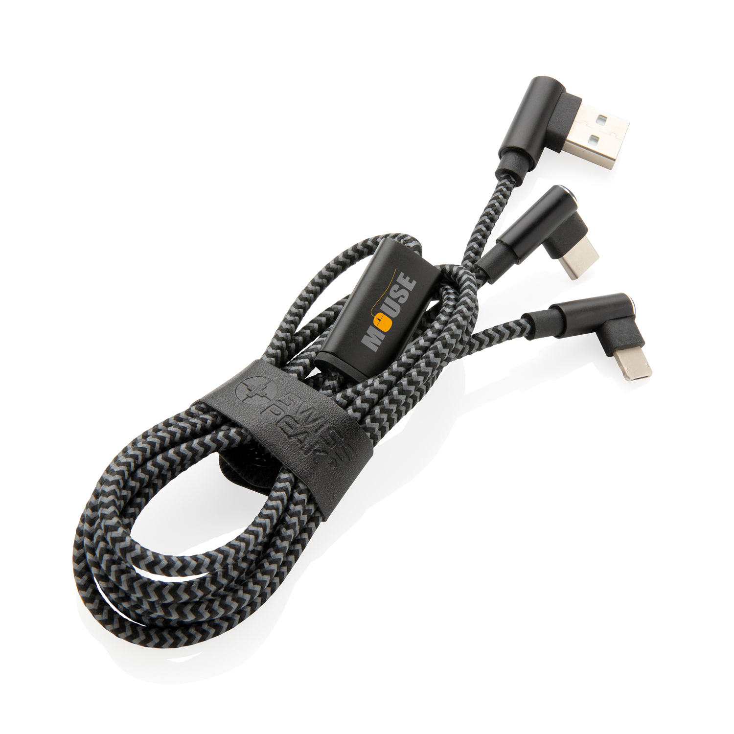Кабель Luxury 3 в 1 с оплёткой из нейлонового материала, разъёмы изготовлены из прочного алюминия. У этого аксессуара предусмотрены три выхода: Type C и комбинированный разъем для устройств на платформе iOS и на платформе Android (micro USB). Угловое расположение разъемов идеально подойдет для зарядки устройств. Длина – 80 см. В комплект входит стильный PU ремешок. Кабель упакован в подарочную коробку.