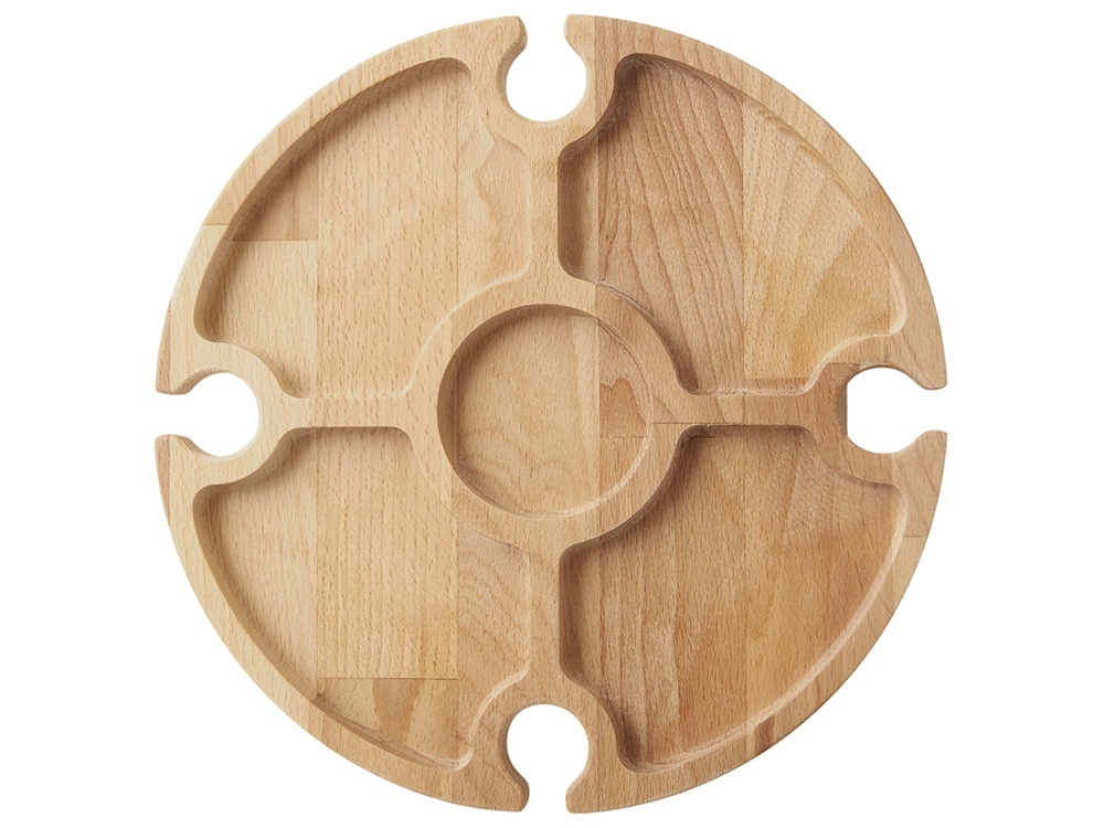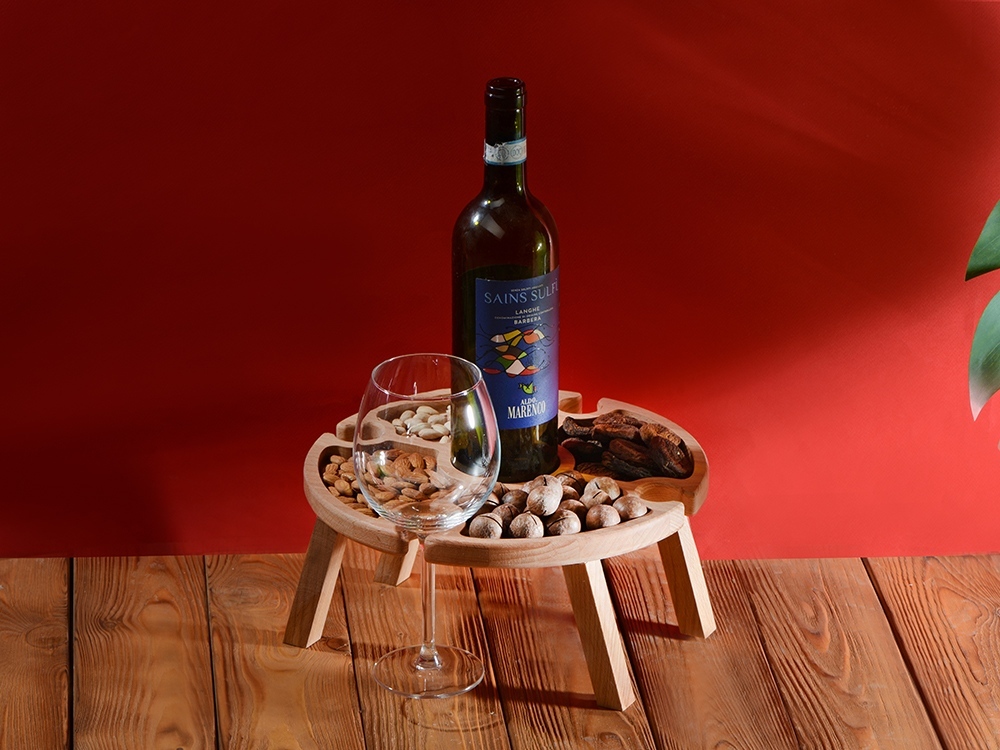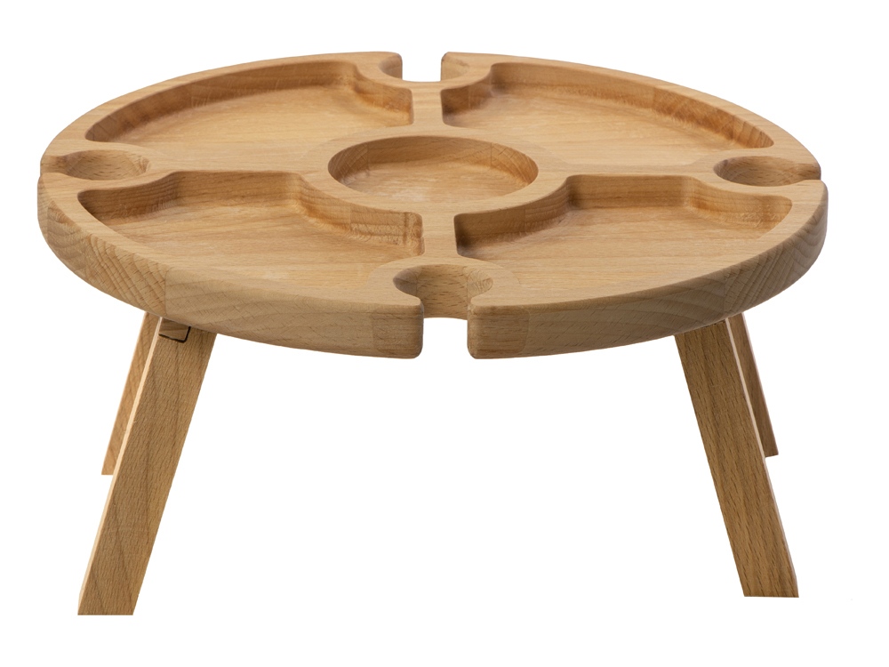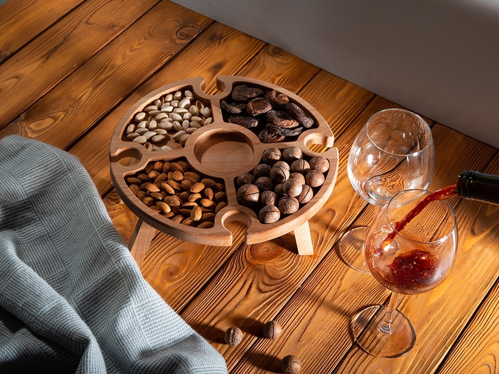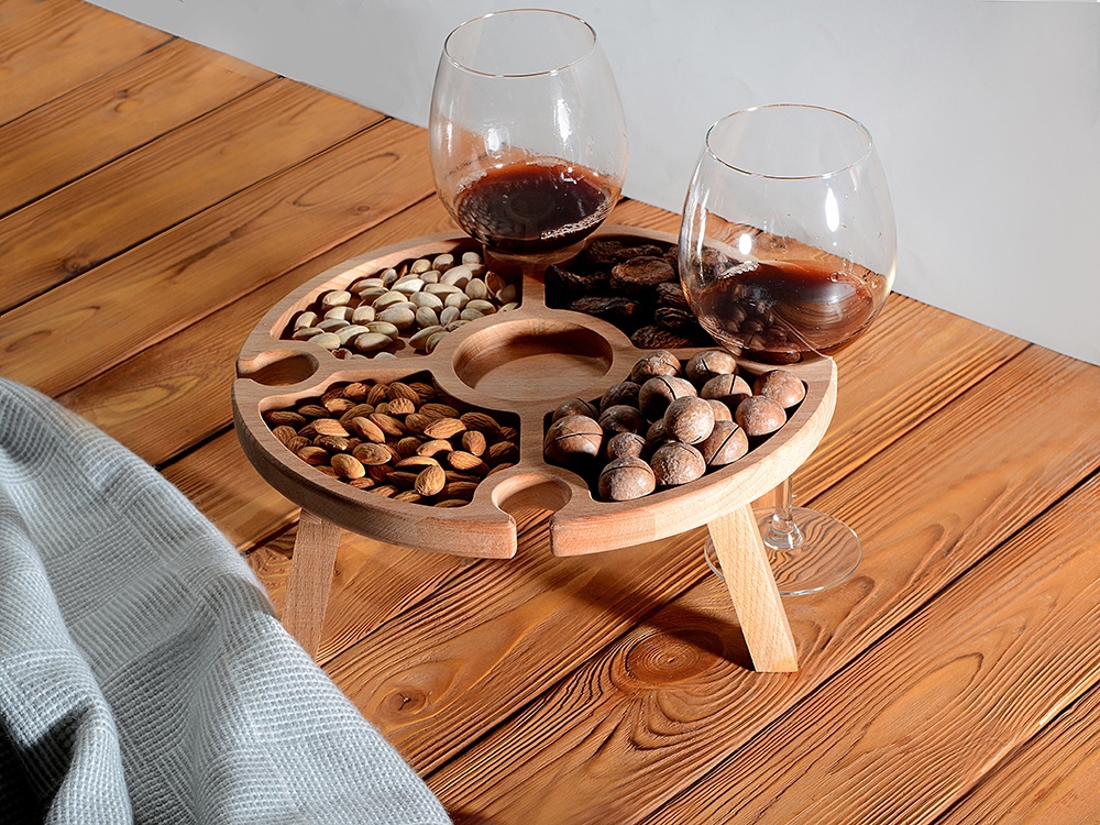 Деревянный столик на складных ножках может быть использован как во время пикников на открытом воздухе, так и дома, где его можно использовать прямо на полу. Столик позволяет подать 4 вида различных закусок, не смешивая их, благодаря четырем сепарированным секциям, в которые можно поместить ягоды, орехи и другие снеки, желательно, сухие либо подающиеся в масле (оливки, маслины). Четыре держателя для бокала особенно актуальны во время отдыха на природе, где каждый участник пикника обязательно оценит возможность зафиксировать посуду для вина.