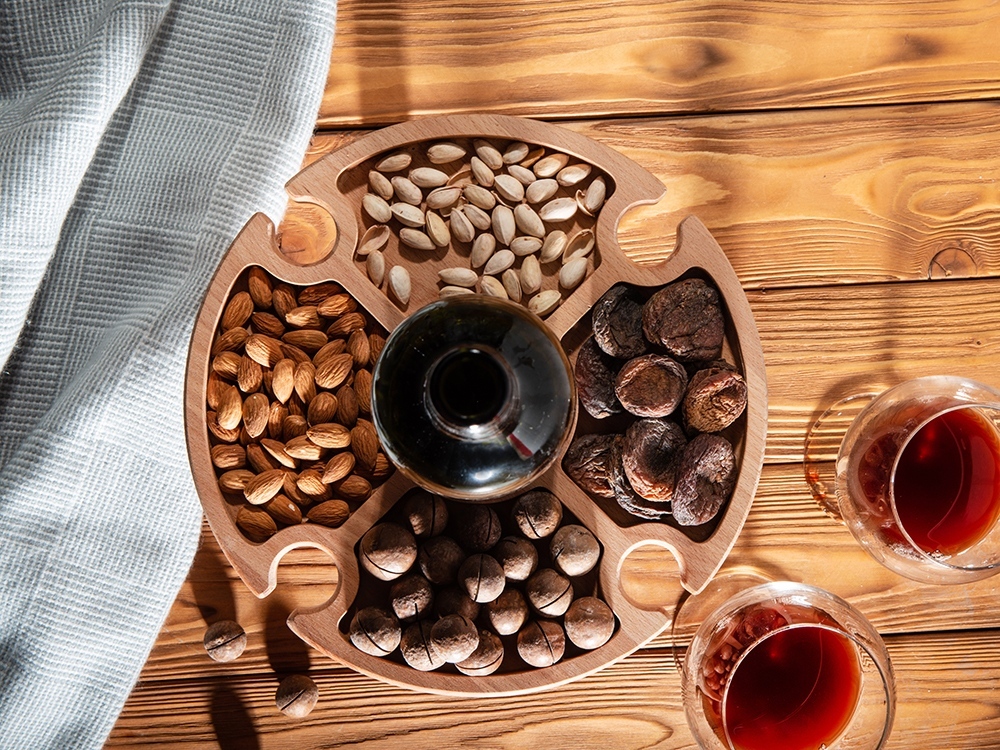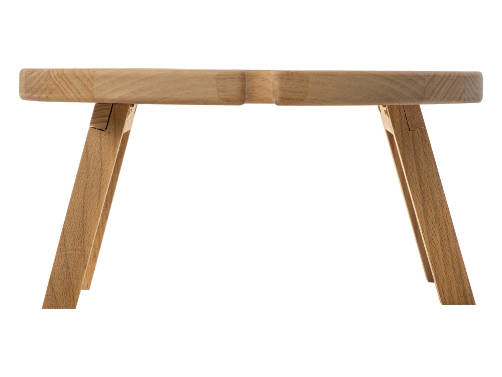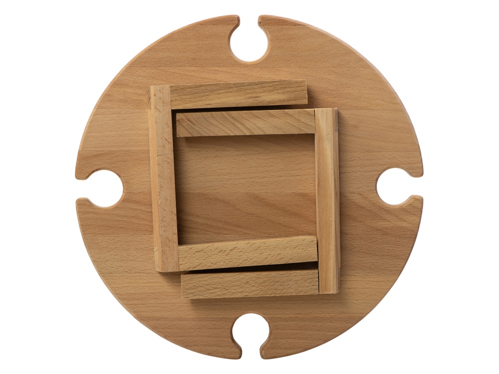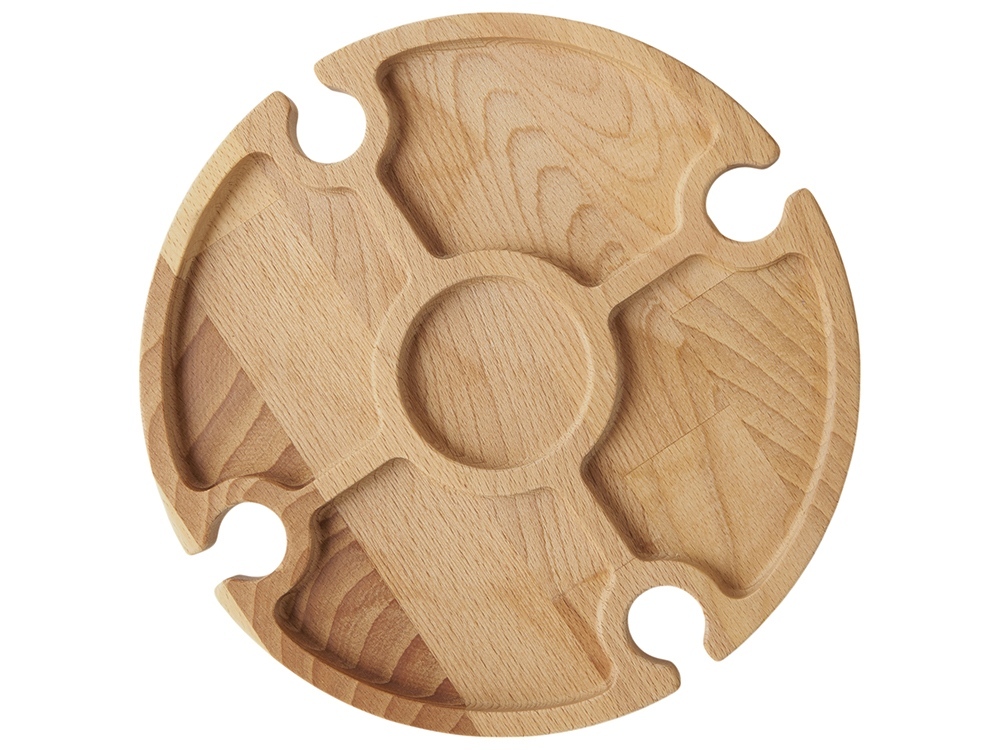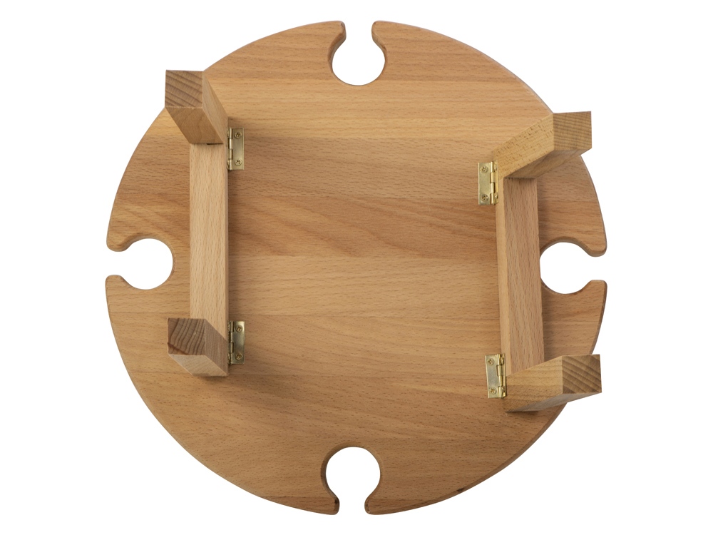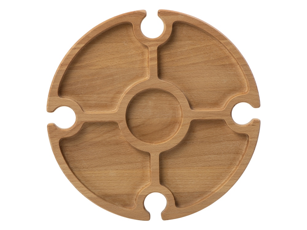 Деревянный столик на складных ножках может быть использован как во время пикников на открытом воздухе, так и дома, где его можно использовать прямо на полу. Столик позволяет подать 4 вида различных закусок, не смешивая их, благодаря четырем сепарированным секциям, в которые можно поместить ягоды, орехи и другие снеки, желательно, сухие либо подающиеся в масле (оливки, маслины). Четыре держателя для бокала особенно актуальны во время отдыха на природе, где каждый участник пикника обязательно оценит возможность зафиксировать посуду для вина.