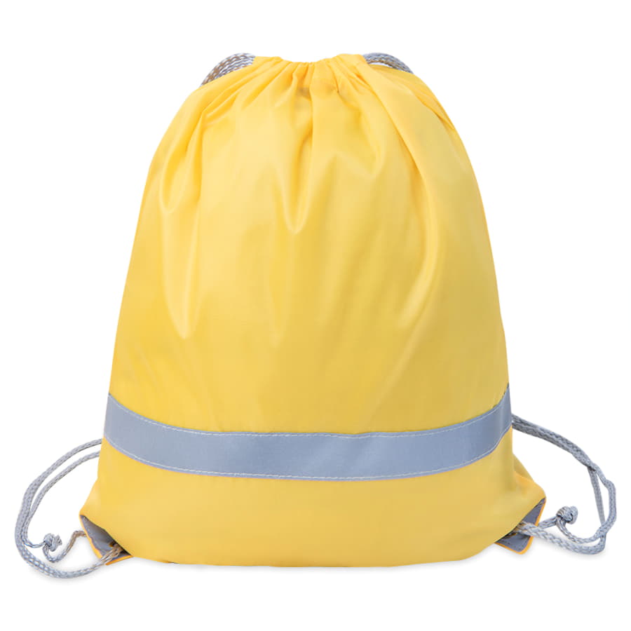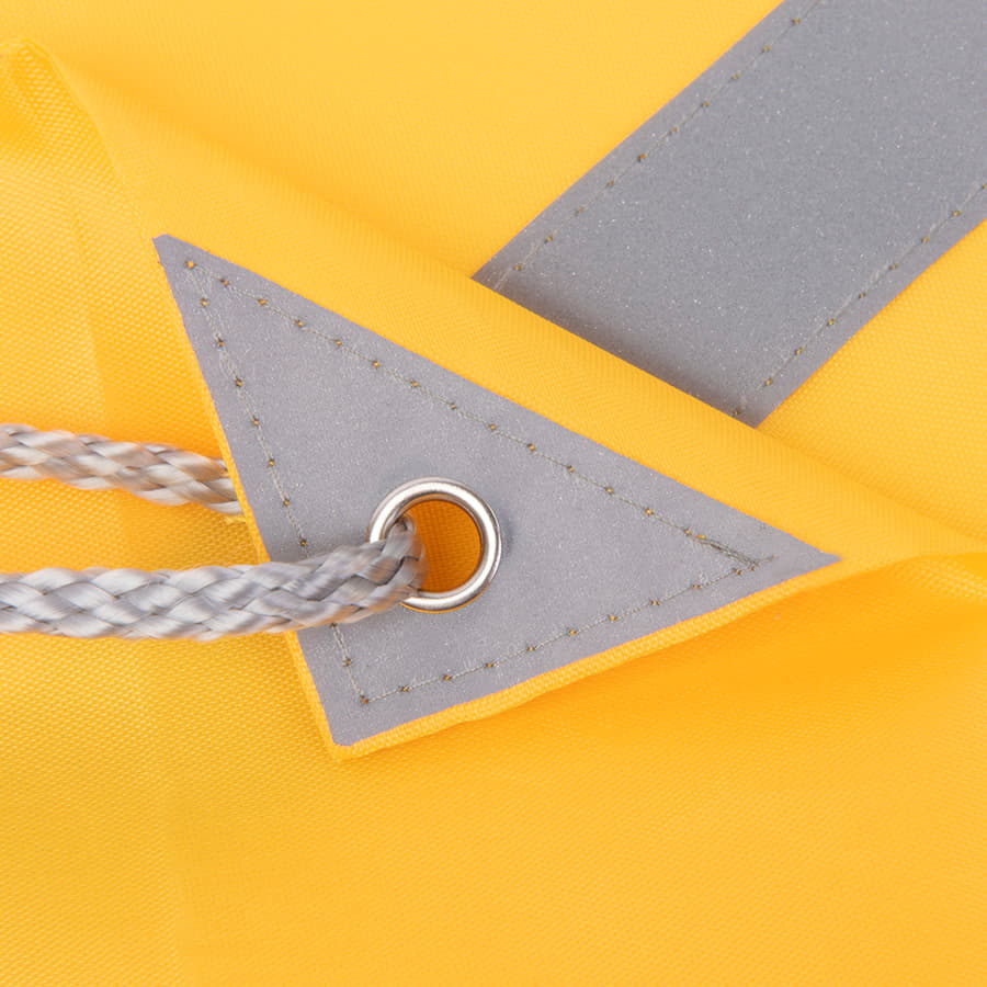 Просто и безопасно! Рюкзак-мешок RAY из полиэстера 210Dсо светоотражающей полосой спереди, светоотражающими уголками,усиленными металлическими люверсамиЛегко и просто затягивается по верхней части серыми шнурами.Жёлтый цвет близкий к Pantone 116C -
