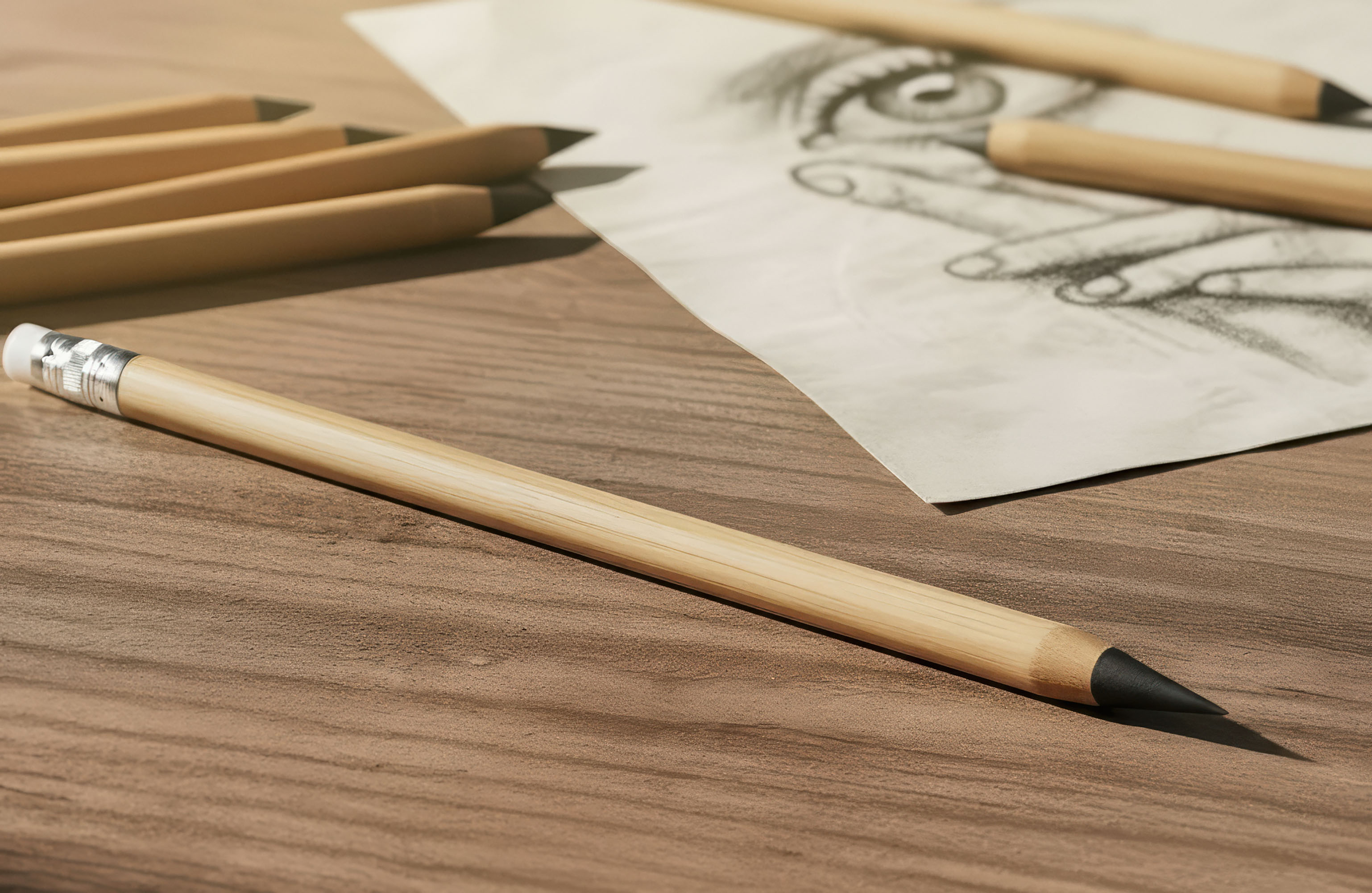 Экоответственный карандаш с защитным колпачком и ластиком. Пищущий элемент выполнен из сверхпрочного графита, длины письма которого хватит до 30 000 метров. -