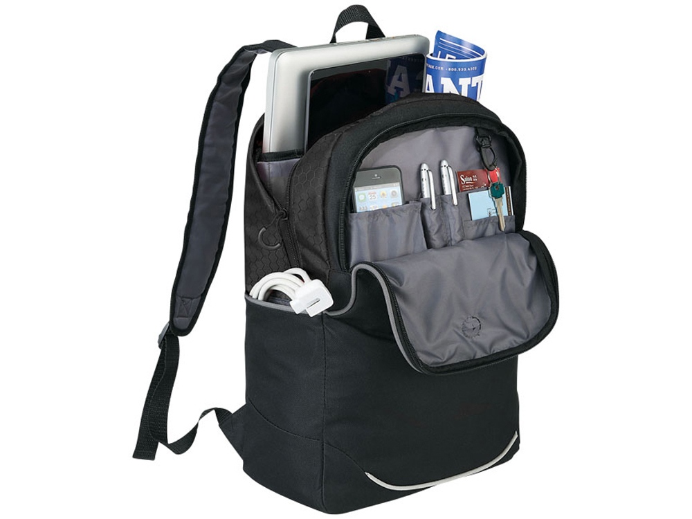 Рюкзак Benton для ноутбука 17. Рюкзак для ноутбука 17Benton с большим основным отделением на молнии и карманом для планшета. Большой передний карман с отверстием для наушников, органайзером для ручек, визиток, технических аксессуаров и других мелочей. Ручка сверху и регулируемые плечевые ремни. 600D полиэстер.