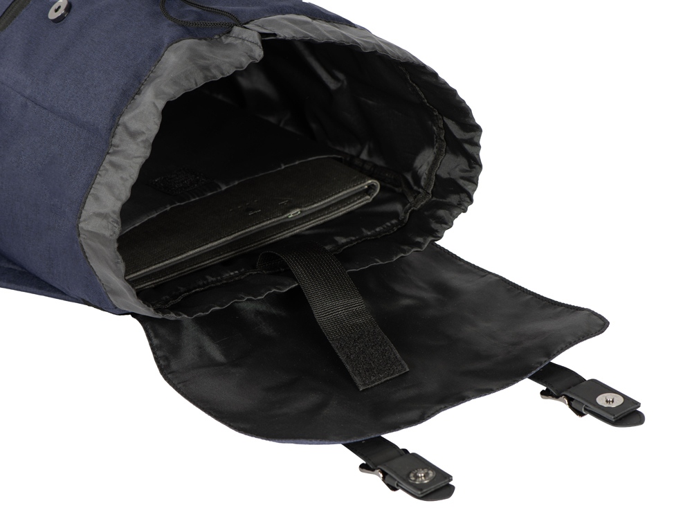 Легкий и вместительный рюкзак закрывается с помощью двух магнитов и стяжки-шнурка. Внутри расположен карман для ноутбука, который фиксируется эластичной лентой на липучке. Снаружи - карман на молнии. Лямки регулируютcя по длине. -