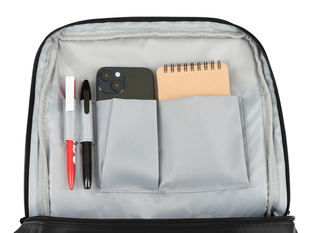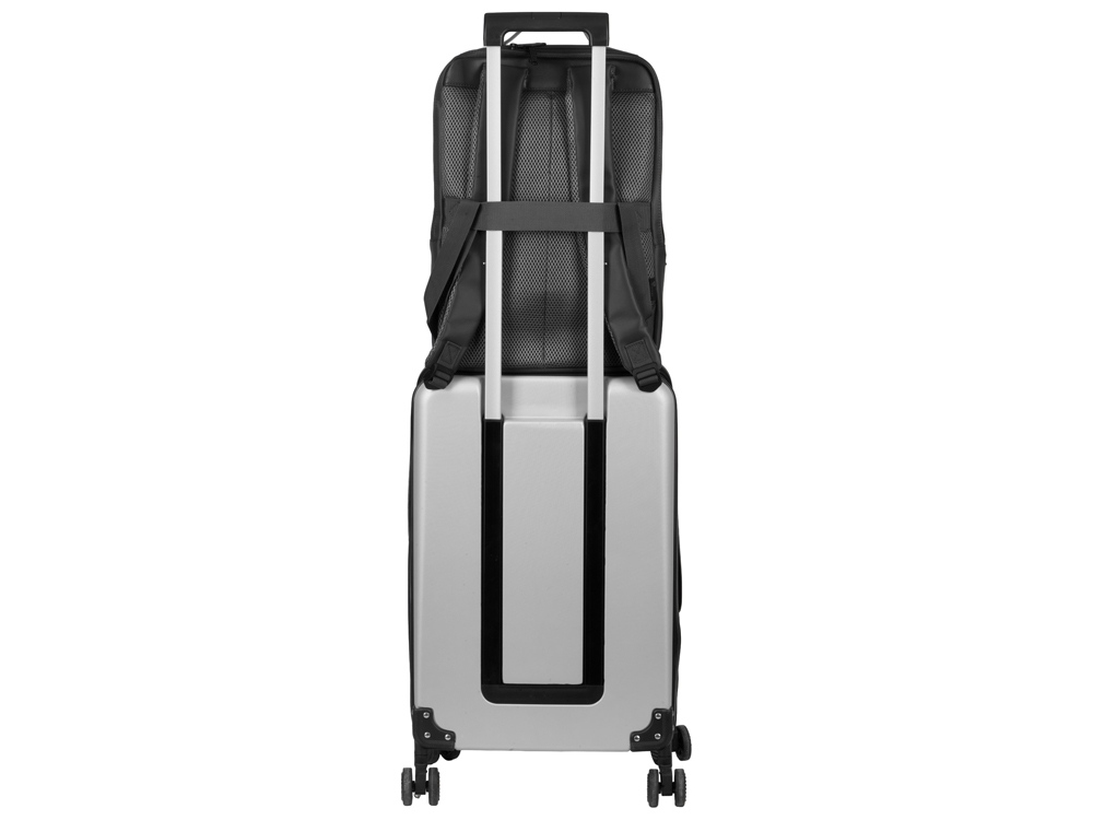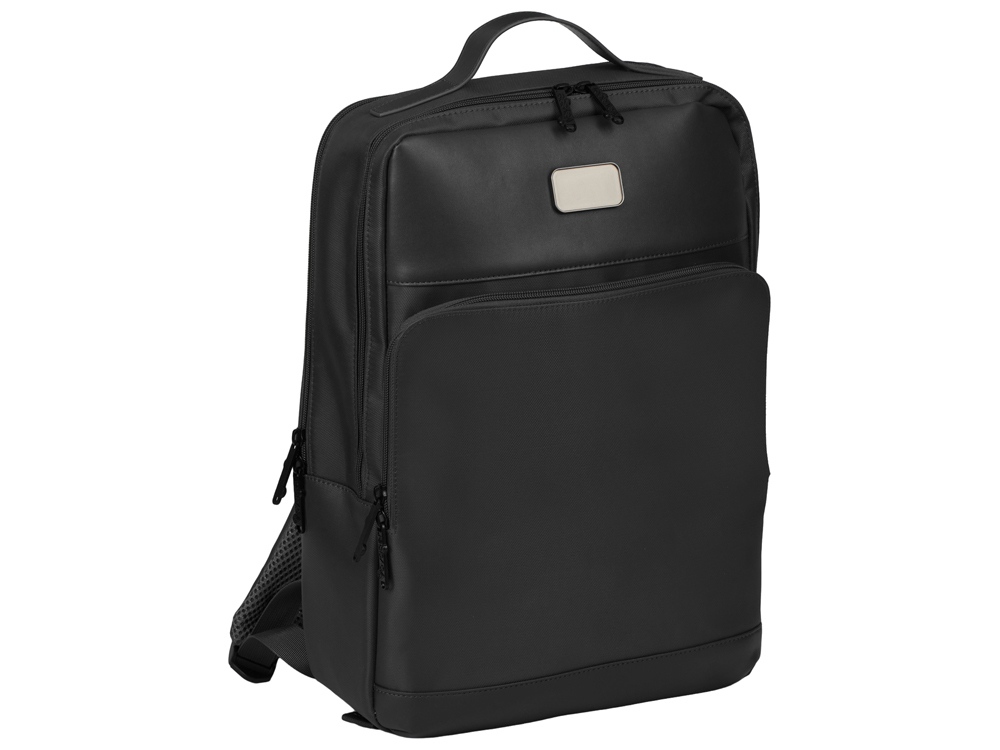 Бизнес-рюкзак из плотной ткани, хорошо держащий форму, имеет строгий и стильный дизайн. Внутри 2 отделения - для ноутбука и для одежды с органайзером и внутренним карманом на молнии. Снаружи расположено большое отделение на молнии. Рюкзак удобен для поездок, при этом компактен и оснащен ремнем для крепления к чемодану. В комплекте нетканый мешок для хранения и съемный металлический шильд для нанесения вашего логотипа.