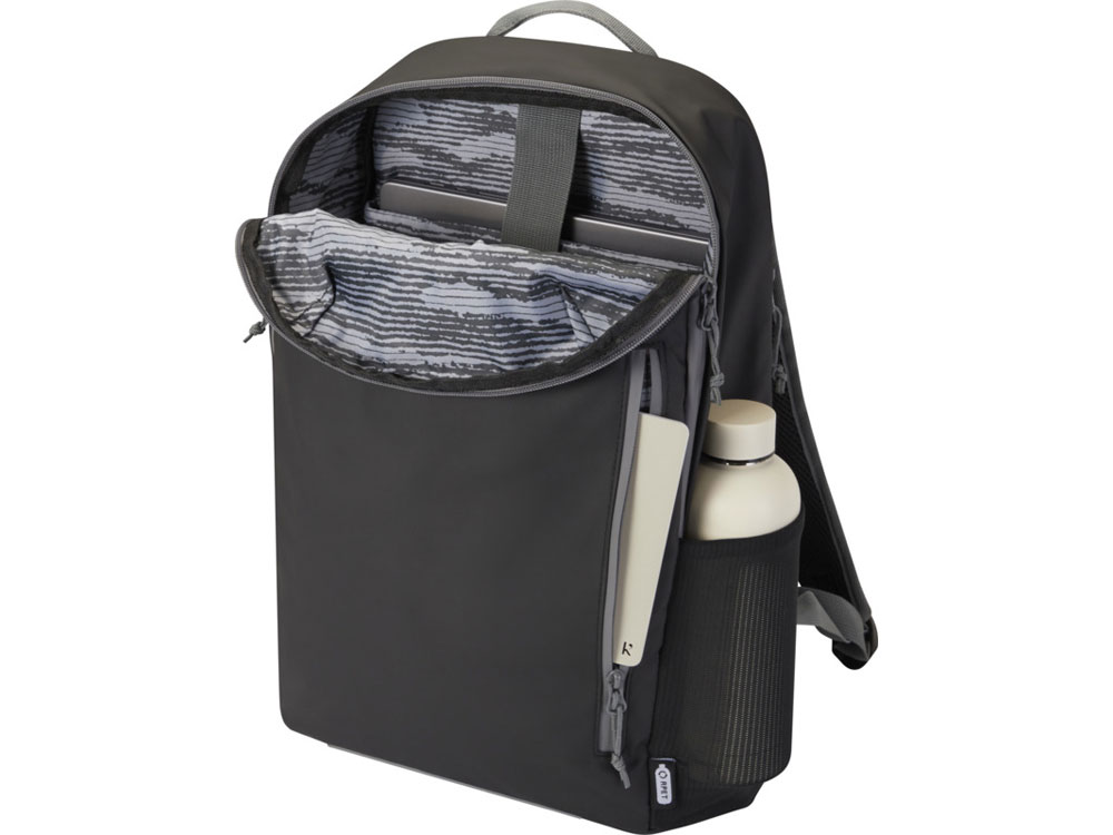 Водонепроницаемый рюкзак для ноутбука, изготовленный из переработанных материалов, сертифицированных согласно стандарту GRS, включая застежки-молнии. Имеет отделение с подкладкой, в которое помещается ноутбук с диагональю 15 дюймов, боковое отверстие для быстрого доступа, несколько сетчатых карманов, передний карман на молнии, а также светоотражающую окантовку для видимости. Формованная мягкая спинка и регулируемый нагрудный ремень обеспечивают комфорт даже тогда, когда рюкзак полностью загружен. Из переработанных материалов, сертифицированных по стандарту GRS, изготовлены основная ткань, подкладка, лямки и застежки-молнии. Емкость: 21 литр. Не содержит ПВХ.