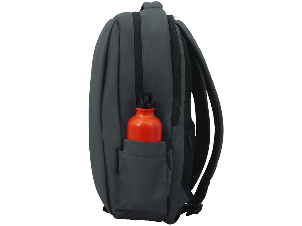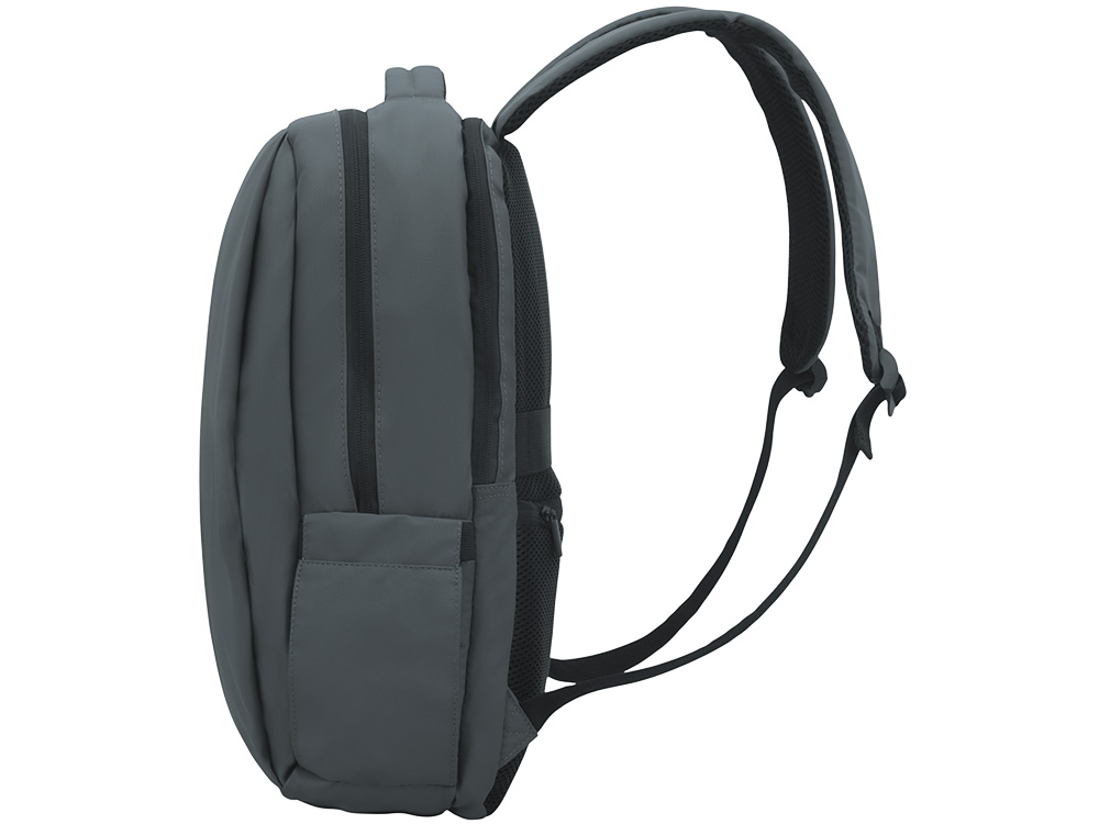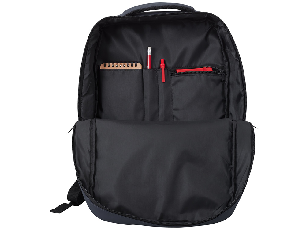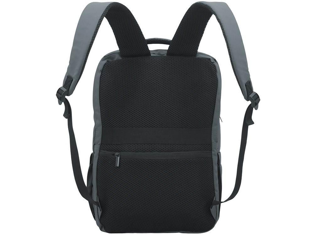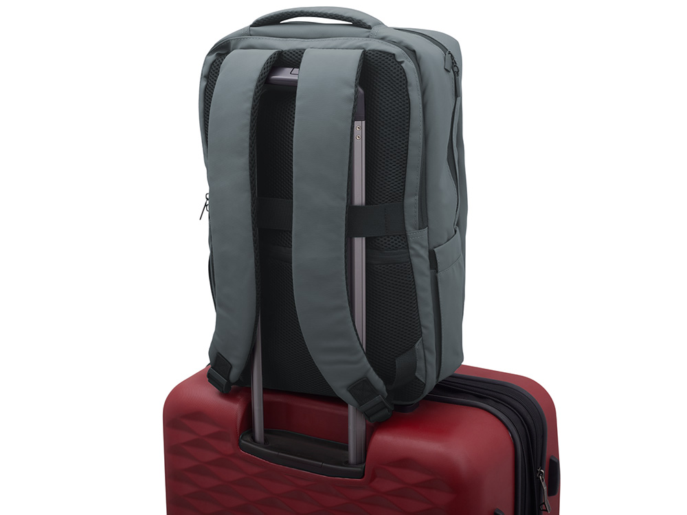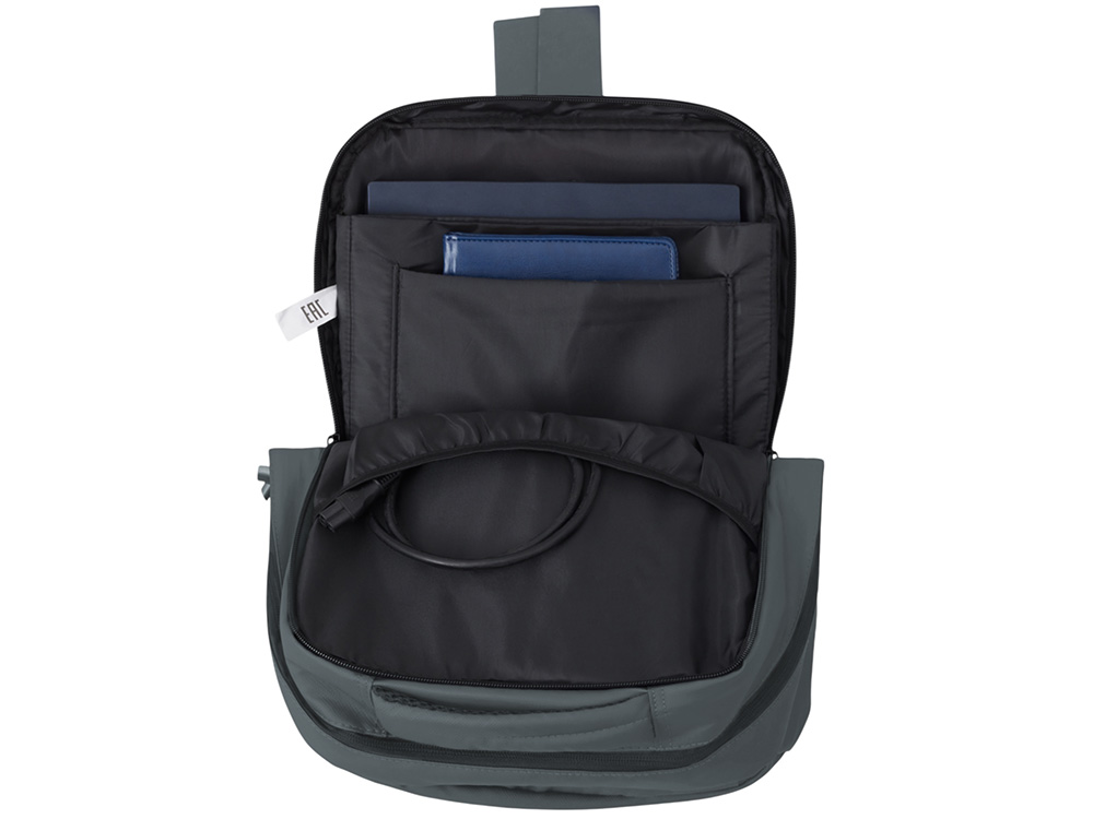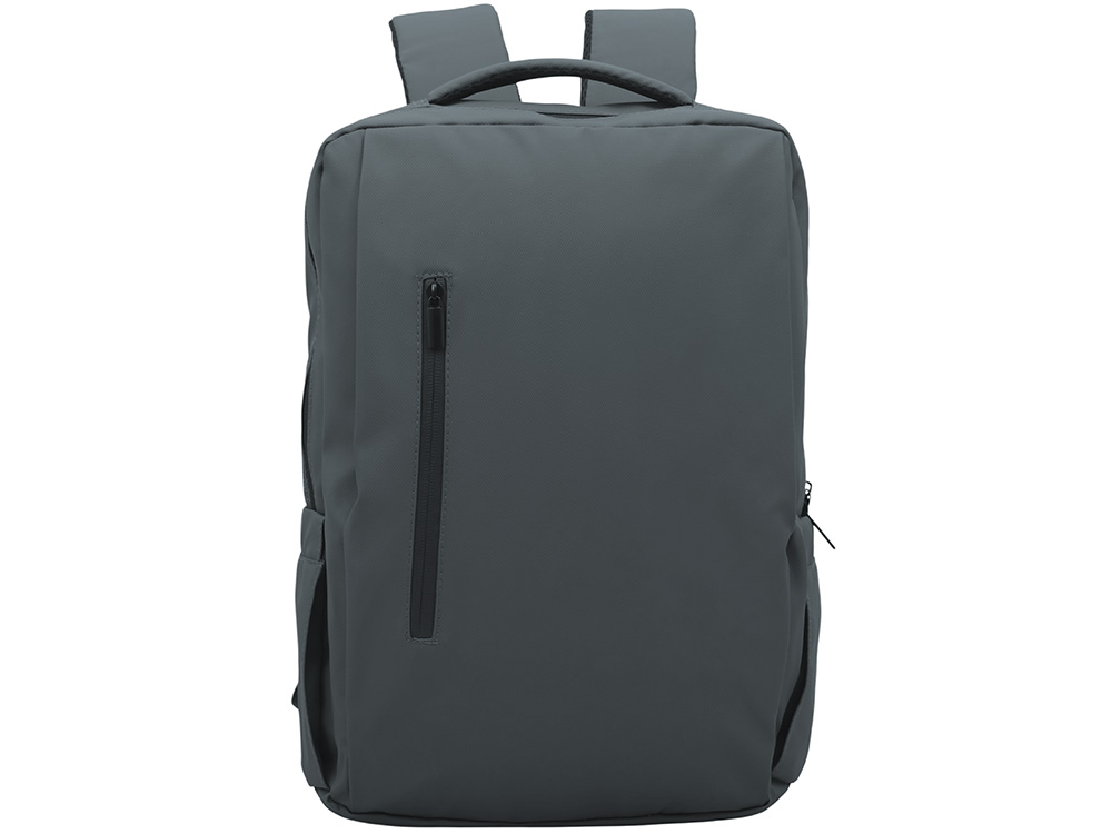 Непромокаемый бизнес рюкзак с двумя вместительными отделениями и карманом на молнии спереди. В одном отделении расположены карман для ноутбука и планшета, в другом органайзер и много пространства для одежды и других вещей на случай деловой поездки. На сетчатой спинке расположен потайной кармана на молнии для документов и личных вещей и ремень для крепления на ручку чемодана. Сверху удобная мягкая ручка для переноски. Лямки регулируются по длине.