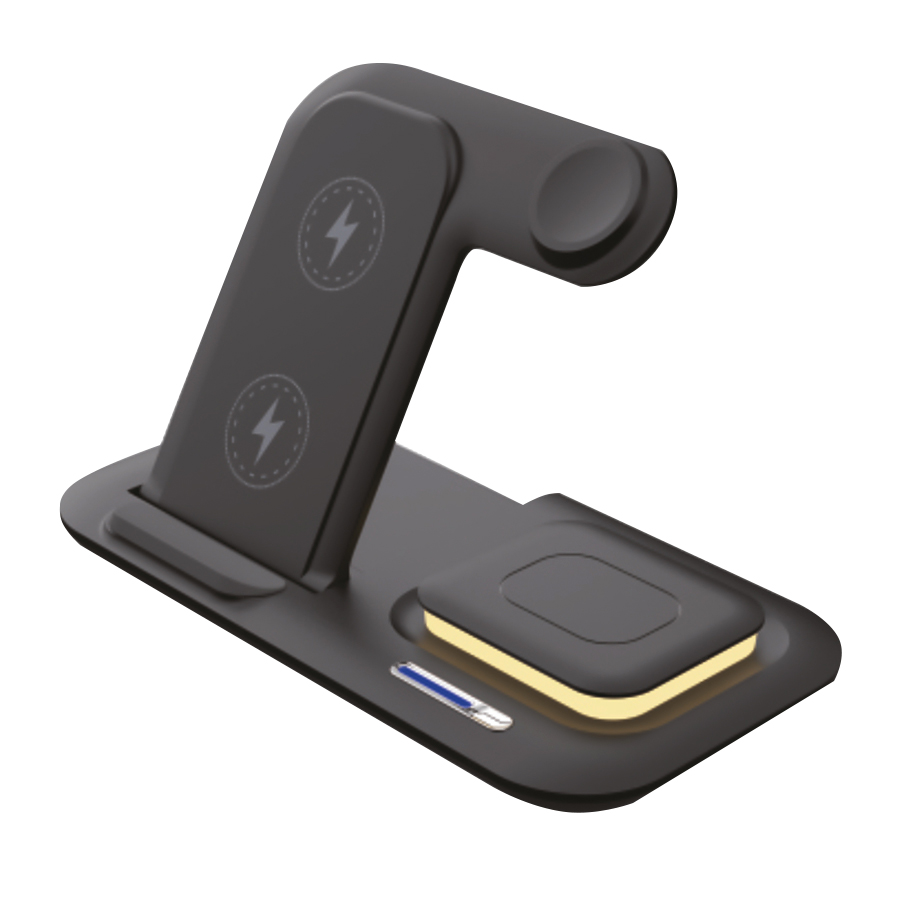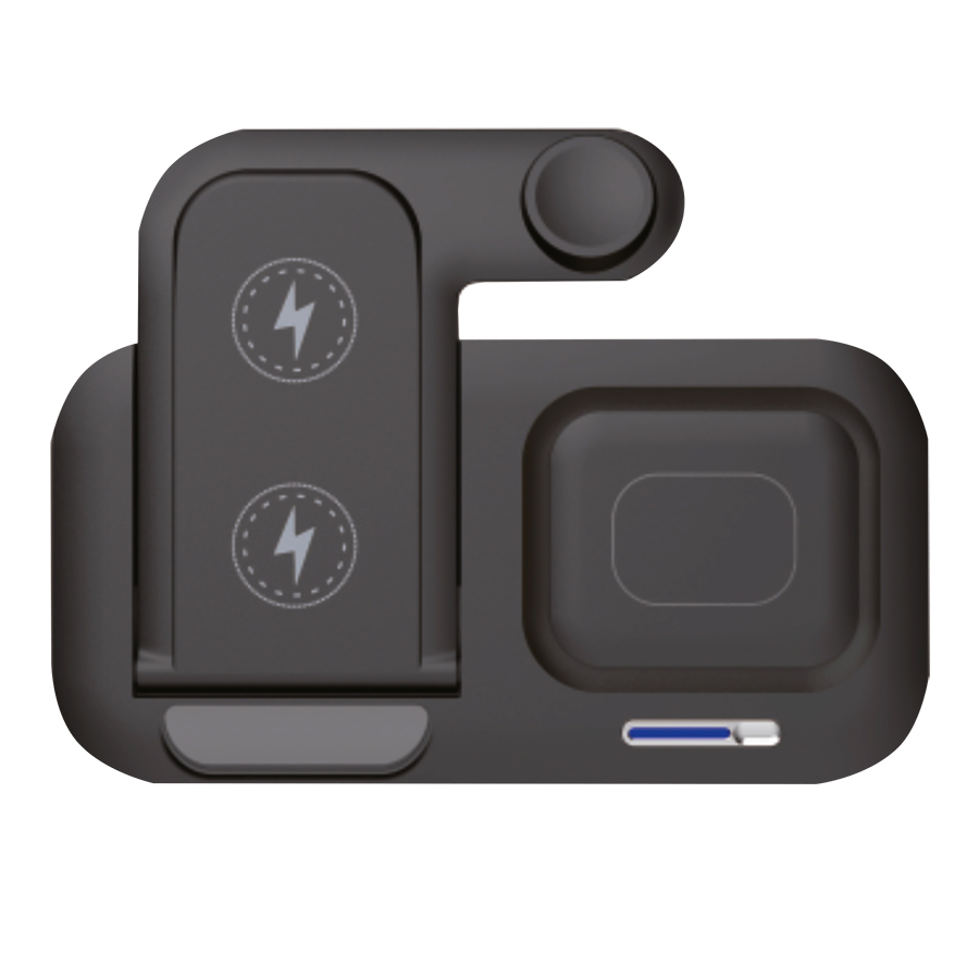 Беспроводная зарядная станция 5в1 мощностью 15 Вт представляет собой многофункциональное устройство, идеальное для зарядки различных гаджетов одновременно. Среди ее особенностей: 1. Зарядка для телефона: стандартная функция зарядки для смартфонов с функцией беспроводной подзарядки Android/Ios. 2. Зарядка для наушников: специальное отделение для беспроводной зарядки наушников с поддержкой технологии Qi. 3. Зарядка для часов: возможность зарядки только умных часов Apple Watch 4. Подставка для телефона: удобная подставка, обеспечивающая устойчивую поддержку смартфона в вертикальном положении во время зарядки. 5. Подсветка для наушников: интегрированный элемент освещения, который помогает легко найти наушники, когда они находятся в зарядной станции. Эта беспроводная зарядная станция предлагает удобство, эффективность и стиль в одном устройстве, идеально подходящем для использования в офисе, дома или на рабочем месте. Для работы беспроводной зарядки необходимо подключать устройство к сети через адаптер. Type - C используется для подключения устройства к сети, USB выход - для зарядки иных устройств.- Виды нанесений: УФ-печать А2, Тампопечать