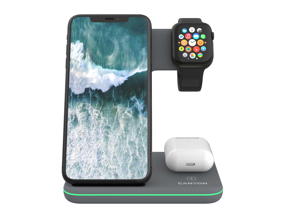 Эта беспроводная зарядная станция с функцией быстрой зарядки совместима с устройствами, оснащенными QI. Конструкция позволяет одновременно заряжать Apple Watch,Airpods, iPhone или смартфон на Android с поддержкой беспроводной зарядки QI. Безопасность и скорость зарядки обеспечивается интеллектуальным чипсетом Novoton.