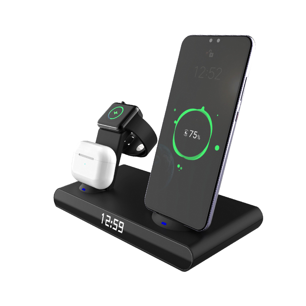Часы электронные Abbatt мультифункциональные с беспроводной зарядкой мощностью 10W. Особенность этих электронных часов заключается в том, что они выполянют функцию не только часов и будильника, а еще с их помощью можно заряжать свои гаджеты. Удобство беспроводной зарядки говорит само за себя - очень комфортно заряжать смартфон, часы и наушники, просто положив их на зарядную станцию, не подключая при этом к ним никаких кабелей. Также есть возможность быстрой зарядки Qi. При беспроводной зарядке устройство меньше подвержено перепадам в сети, чем при подключении к розетке, тем самым увеличивается срок службы аккумулятора. Благодаря интерфейсу Type-C (шнур идёт в комплекте 1м) ваши гаджеты будут заряжаться более эффективно, а главное - одновременно. Вы можете смотреть фильмы, слушать музыку, звонить или отправлять сообщения во время всего процесса зарядки. Входы: 9V/2A 12/2A. Выходы: Беспроводной 10W / 7.5W / 5W / USB 5V / 0.8-1A / Airpod 3W / Apple watch 2.5W. Совместимость с Apple 8 и выше. Размер в упаковке: 21,5*13,5*5,5 см. Поддерживаемые устройства: 1) Область зарядки смартфона поддерживает все Android/Ios устройства с функцией беспроводной зарядки. 2) Область зарядки наушников поддерживает все Android/Ios устройства с функцией беспроводной зарядки. 3) Область зарядки часов поддерживает только устройства AppleWatch Для работы беспроводной зарядки необходимо подключать устройство к сети через адаптер.- Виды нанесений: УФ-печать А2, УФ-Лак, УФ-Цвет+Лак