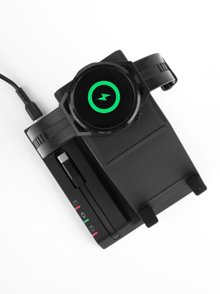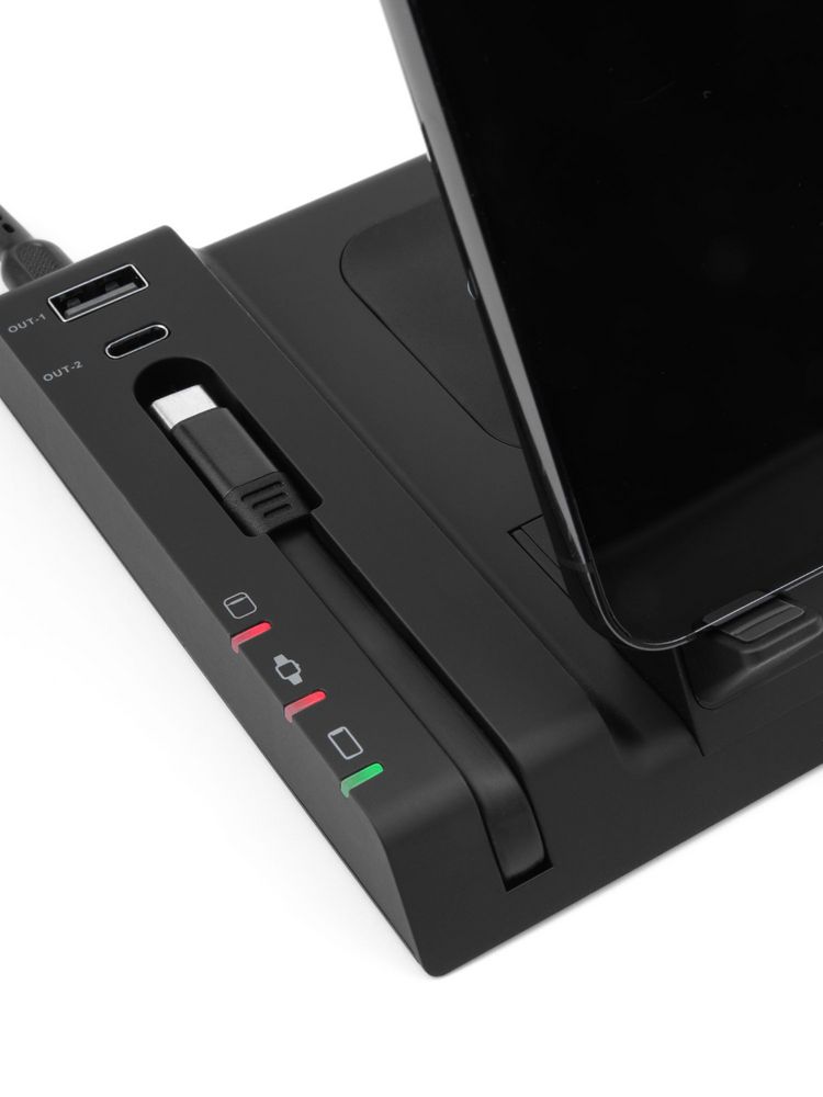 Благодаря компактным размерам станция не займет много места на рабочем столе или прикроватной тумбе, а все любимые электронные помощники всегда будут под рукой.- Выходная мощность беспроводного заряда при использовании зарядного устройства QC 2.0–3.0 (25–30 Вт) с параметрами зарядки 5 В, 3 А; 9 B, 2,4 A; 12 В, 2A: