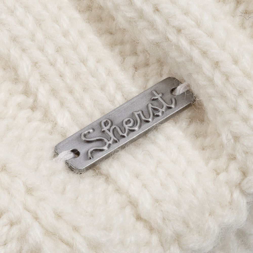 Металлический шильд с названием бренда расположен у заднего шва шапки. Это оставляет место спереди для пришива лейбла или шильдика с логотипом заказчика. -