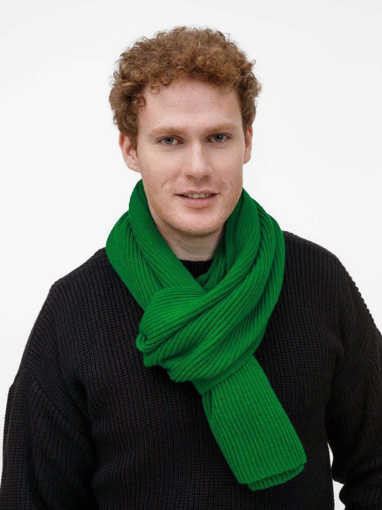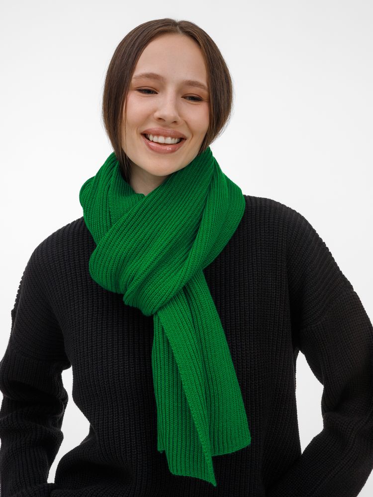 Широкий шарф из мягкой полушерстяной пряжи с выразительной фактурной вязкой создает современный запоминающийся образ.