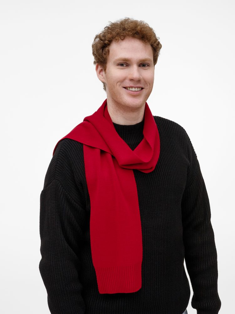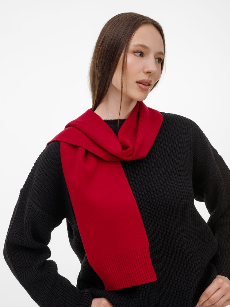 Классический однослойный шарф гладкой вязки. Края, связанные резинкой, придают изделию завершенный и аккуратный вид.