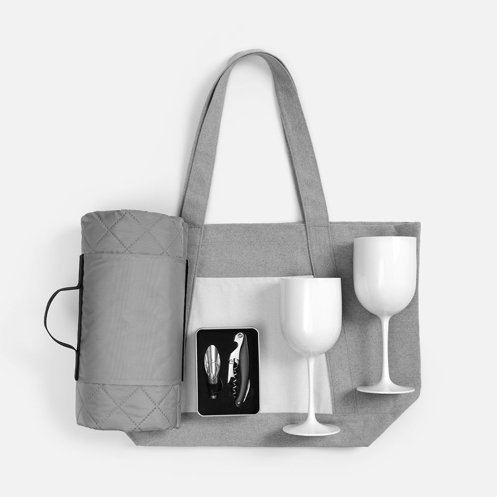 плед - флис, плотность 220 г/кв.м; полиэстер; шопер - полиэстер 60%, переработанный хлопок 40%, плотность 340 г/кв.м; набор для вина - нержавеющая сталь, пластик; бокалы - пластик