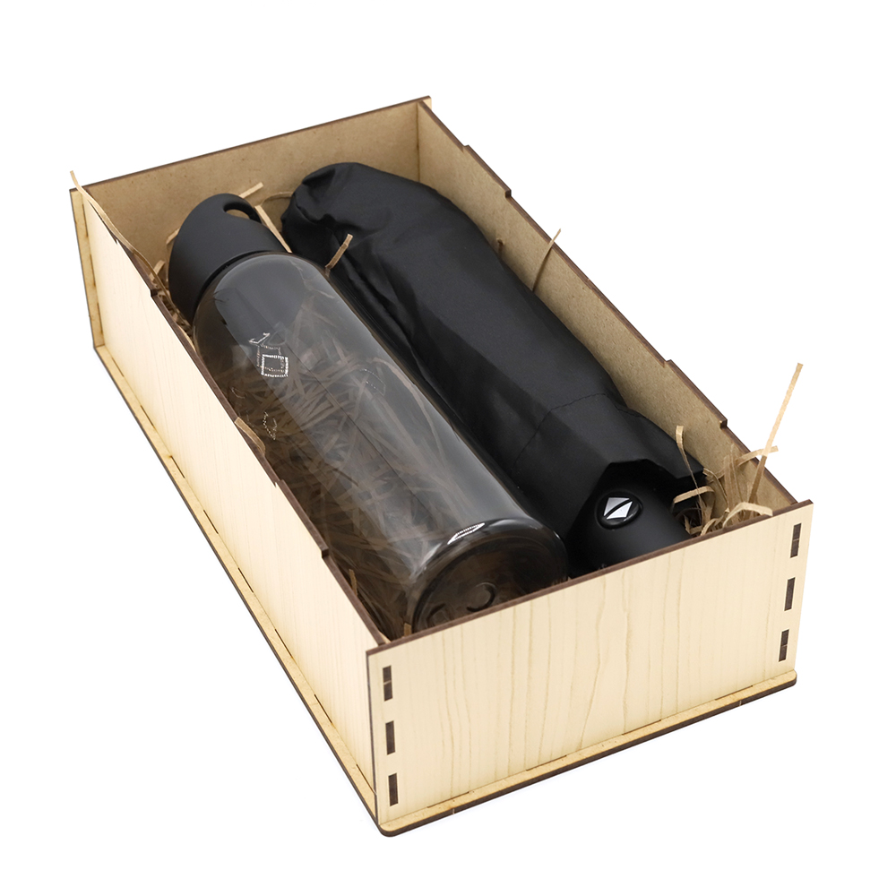Прекрасный набор станет незаменимым помощником в любом путешествии, командировке или прогулке по городу. Отличный подарок вашим родным, друзьям, любимым и коллегам! Упаковка из древесноволокнистной плиты высокой плотности (ХДФ/HDF) обеспечивает удобство погрузки и разгрузки, сохранность в пути. Состав набора: Упаковка из древесноволокнистной плиты - 1 шт. (Артикул: 53064) Автоматический противоштормовой зонт Vortex - 1 шт. (Артикул: 8004.02) Бутылка пластиковая для воды Sportes - 1шт (Артикул: 14009.02) Наполнитель - стружка бумажная, бежевый – 1 шт. (артикул: 62000.13)