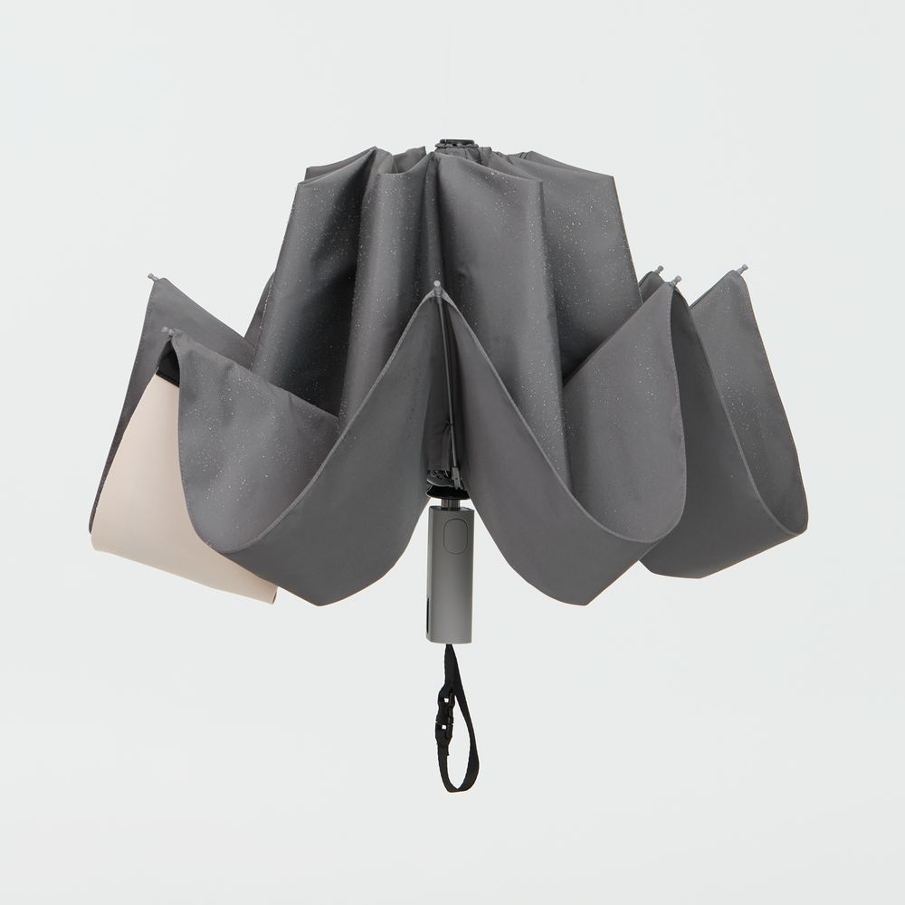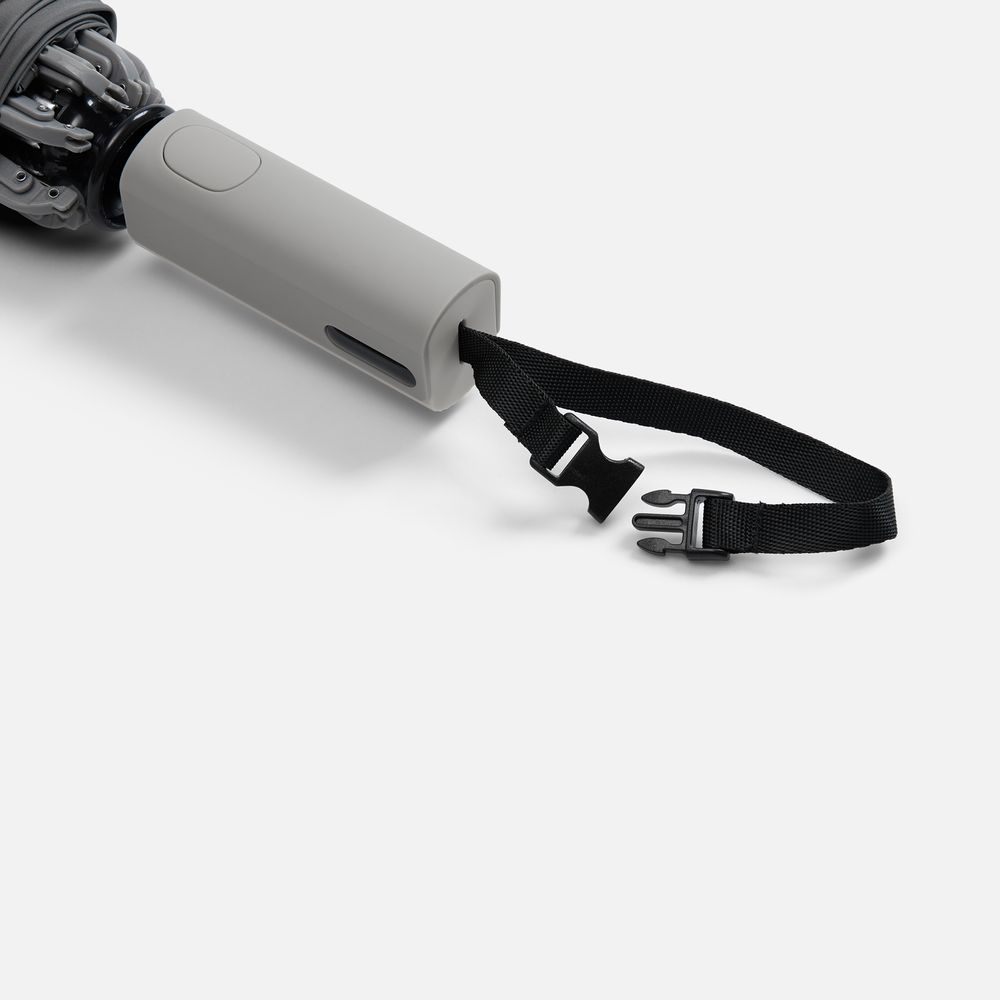 Складываясь после дождя, он прячет мокрую поверхность внутри, а сухая остается снаружи: в закрытом положении зонт не побеспокоит окружающих и не намочит одежду. Благодаря застежке на ремешке зонт удобно подвесить, например, на рюкзак.