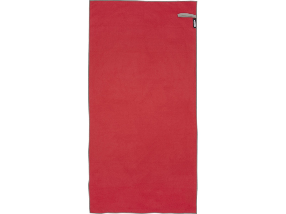 Спортивное полотенце Pieter очень хорошо впитывает влагу, легкое, быстро сохнет, а ткань прочная и очень мягкая. Когда полотенце сложено и закреплено резинкой, оно уменьшается до небольшого размера, поэтому его удобно брать с собой в тренажерный зал, бассейн, на пешую прогулку или в поход. Полотенце размером 50 х 100 см изготовлено из 90 % переработанного полиэстера GRS и 10 % нейлона. Его можно стирать в стиральной машине при температуре 40 °C. В комплект поставки входит мешок для хранения (17 x 13 см), изготовленный из переработанного ПЭТ-пластика, обеспечивающий большую площадь для печати логотипа. 90% Переработанный Полиэстер, 10% Нейлон, 200 g/m2.