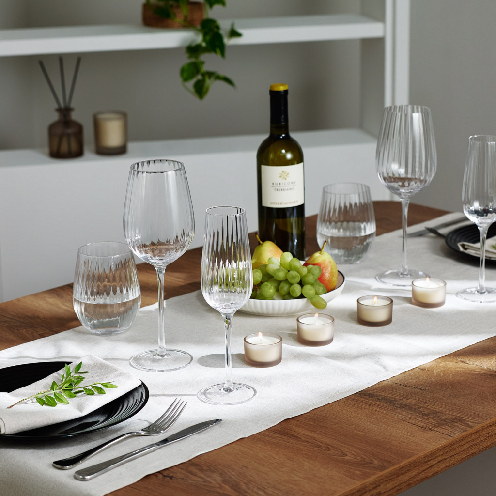 Секрет в уникальном рифлении, создающем игру света и тени, которая превращает дегустацию в искусство. Утонченный дизайн гармонично сочетается с любой сервировкой, от классической до современной. Создайте свой безупречный набор, дополнив его бокалами для шампанского и стаканами для воды.