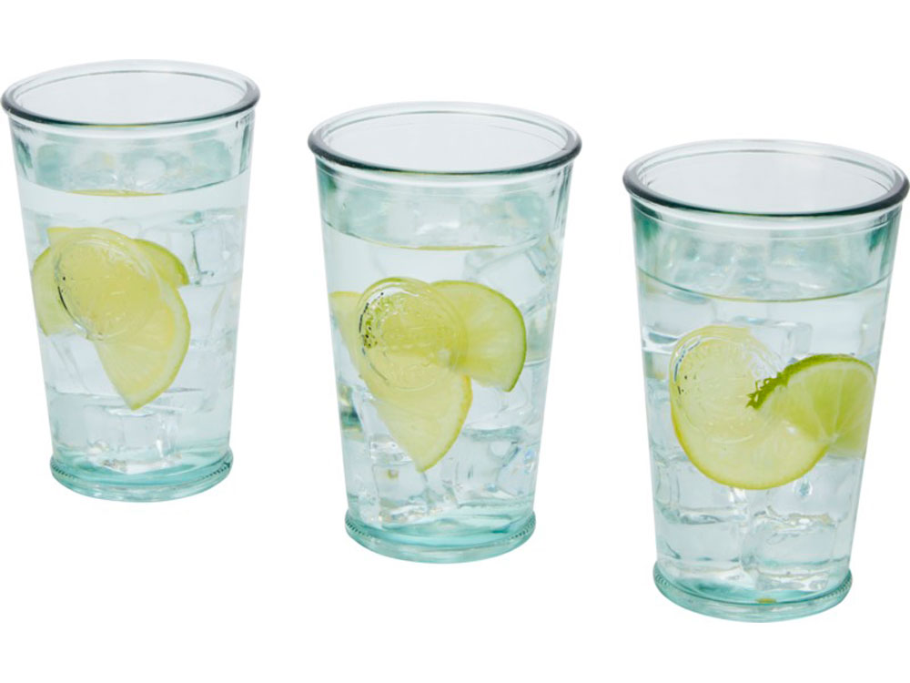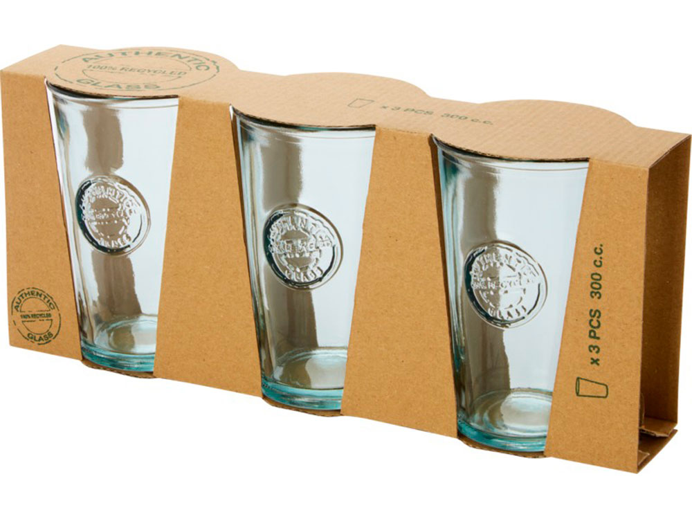 Набор из 3 стаканов объемом 300 мл, изготовленный из переработанного стекла. Для создания этого набора использована 1 стеклянная бутылка. Переработанное стекло не отличается ничем по качеству от обычного, но при этом является более экологичным, ведь на изготовление этого материала тратится меньше энергии, сырья и примесей. Размер стакана: высота 13 см, диаметр 8 см. -