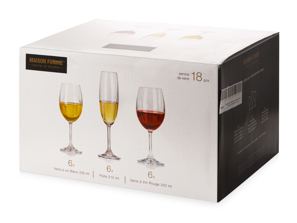 Подарочный набор из 18 бокалов для красного, белого и игристого вина. В наборе по 6 шт. каждой модели. Поставляется в индивидуальной цветной коробке. -