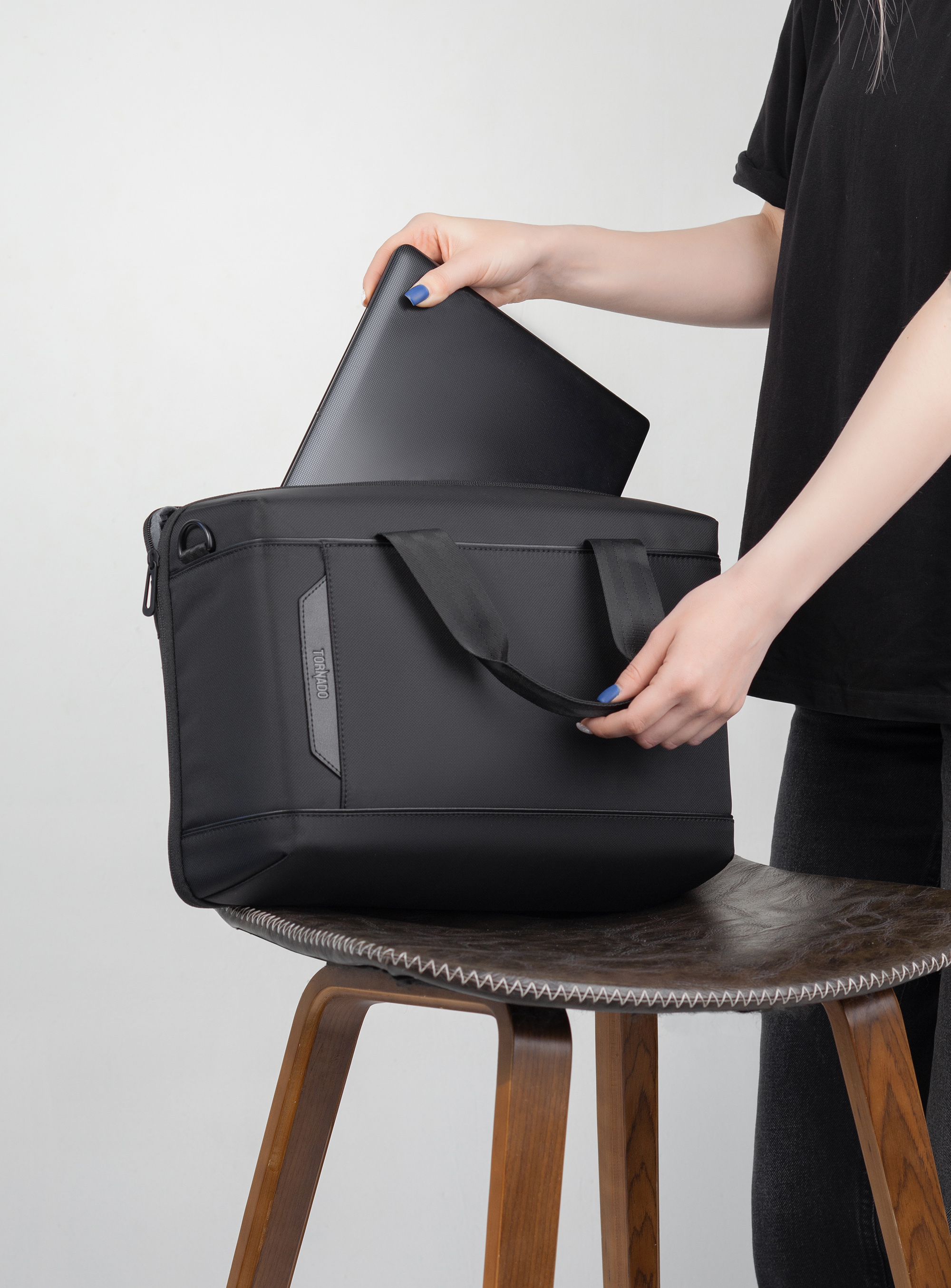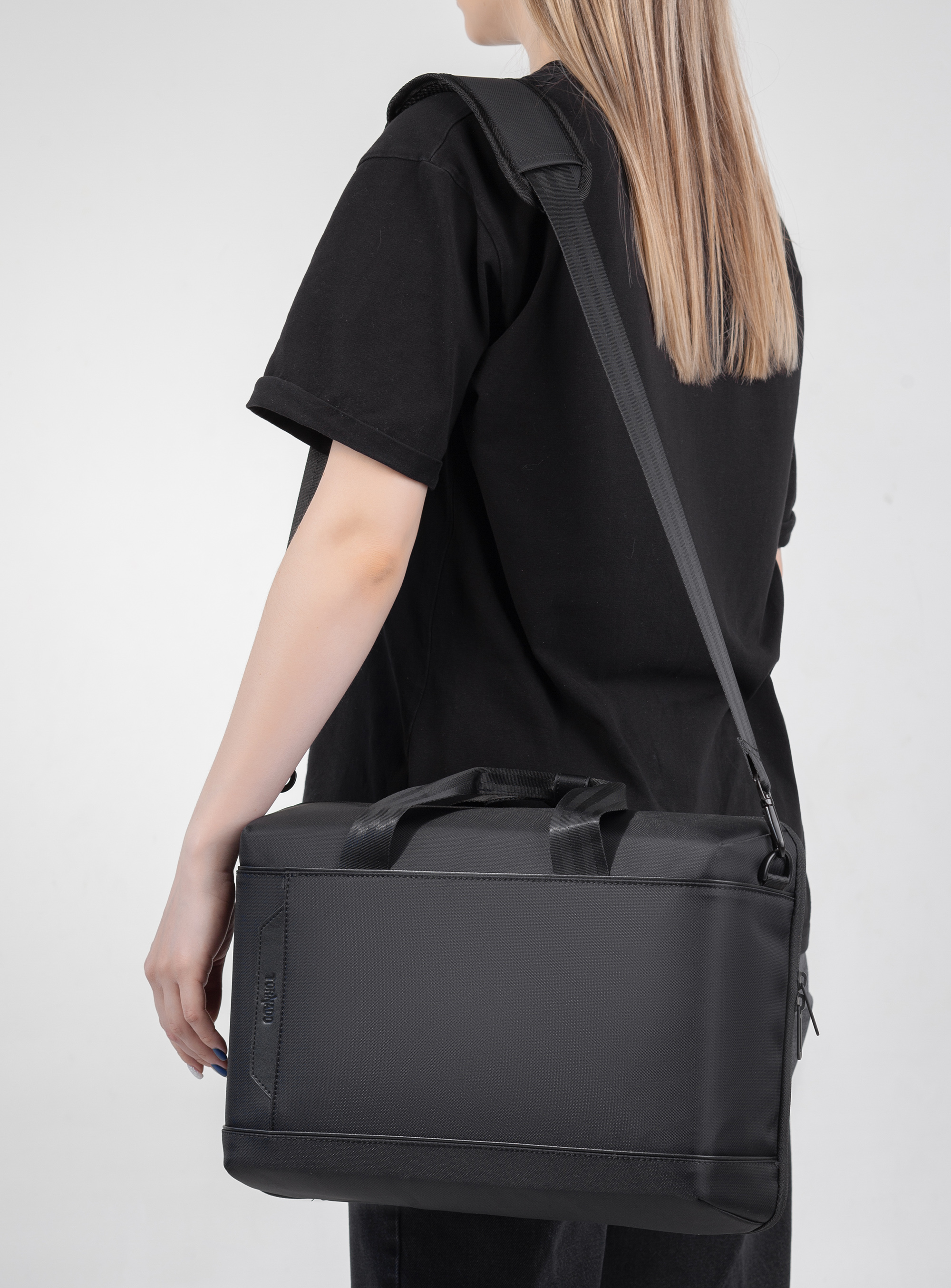 Размер сумки позволяет разместить ноутбуки c диагональю до 15,6", также достаточно места для зарядного блока и дополнительных аксессуаров. Объем 10 литров.