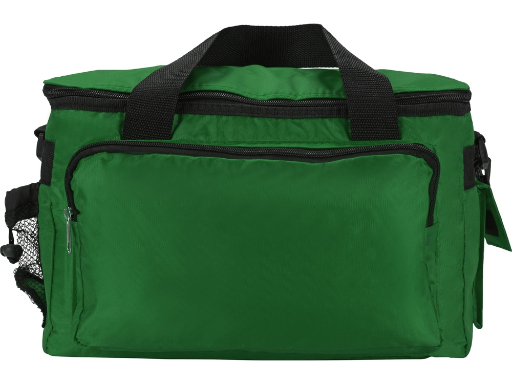Вместительная сумка-холодильник (объем – 15 л.) Камайоре прекрасно подойдет не только для индивидуальных пикников, но даже и для доставки горячих продуктов (пиццы, например). С боков 2 кармана – один сетчатый с регулируемой затяжкой для бутылки. Другой для приборов, салфеток или других мелочей закрывается на липучку. Наружный слой сделан из полиэстера, на него может быть нанесена персонализация: имя владельца или логотип компании.