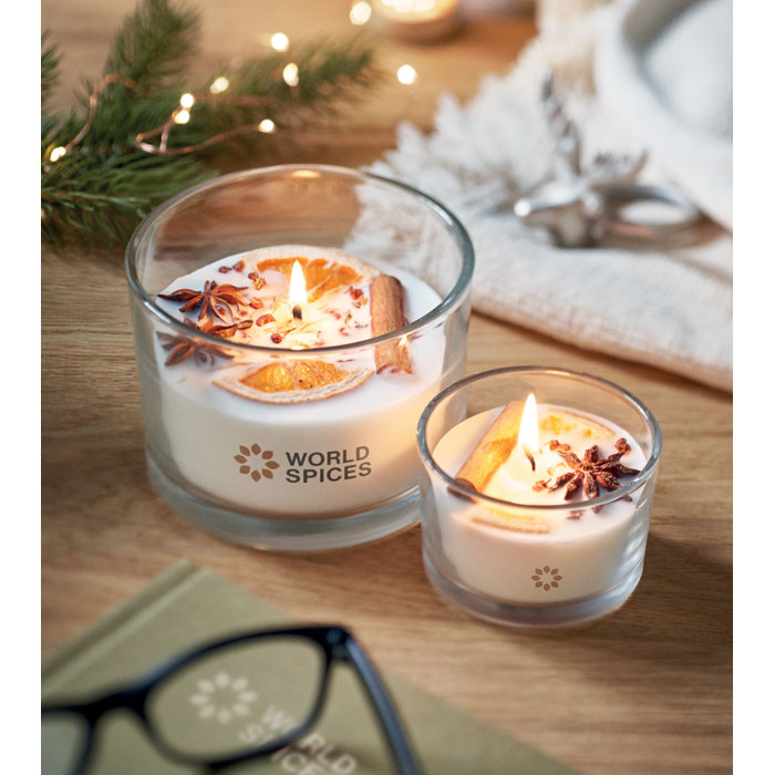 Небольшая восковая свеча на растительной основе с ароматом корицы и цитрусовых, с засушенными цветами и фруктами в стеклянном стаканчике. 85 гр. Время горения: 14 часов. -