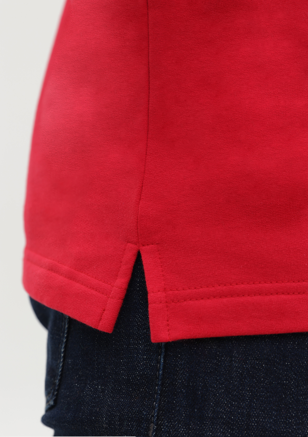 Свободный силуэт, округлый вырез, рукав-реглан и декоративные элементы, отсылающие к классическому крою. Ворот и манжет выполнены широкой эластичной резинкой.
