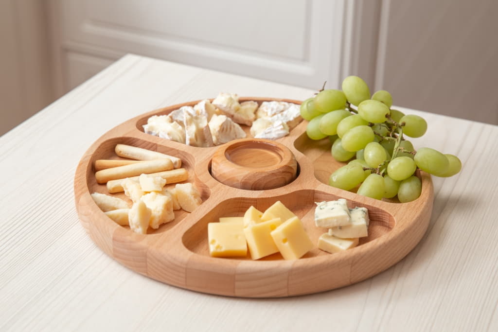Менажница круглая d=23см, выполнен из премиум материала бук. Материал отличается следующими преимуществами: Прочность - премиум материал дерева Бук Безопасность - обладает противомикробными свойствами, не вызывает аллергических реакций Простой в уходе - моется теплой водой, допускается использование средств для мытья посуды Экологичность - натуральное и безопасное сырьеУдобство - устойчив на любых плоских поверхностях, включая диваны и кровативозможно привезти под заказ тираж от 1000 шт -