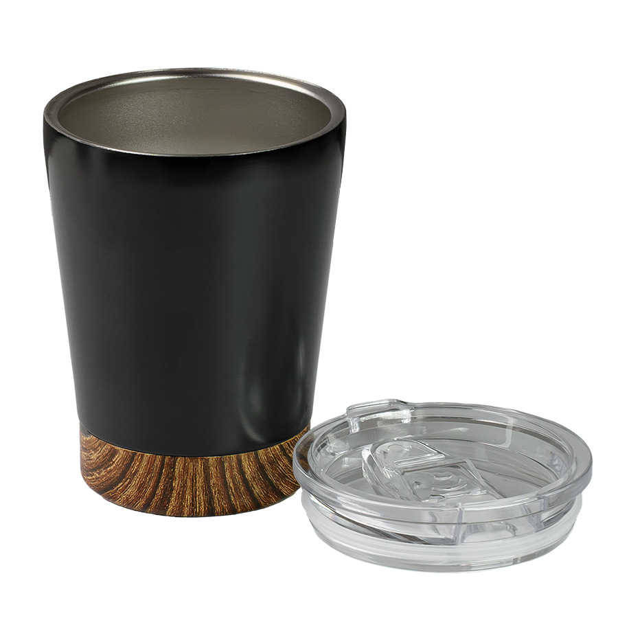 Стильная термокружка с черным матовым корпусом и декоративной вставкой с имитацией фактуры дерева soft-touch. Двойные стенки из стали сохранят напиток горячим до 3х часов. Высота без крышки 11,4 см, подходит для большинства кофемашин. Индвидуальная упаковка - белая картонная коробка -