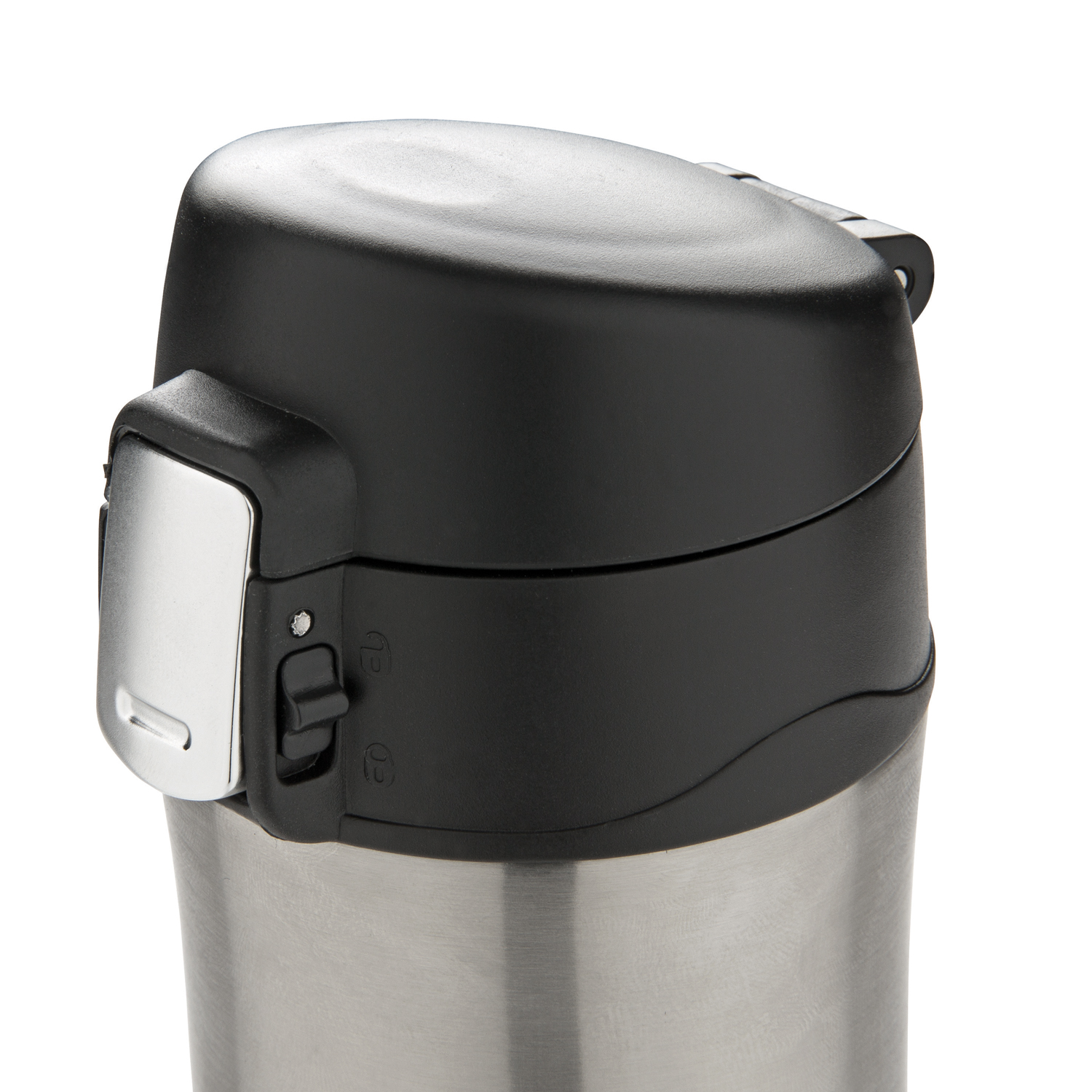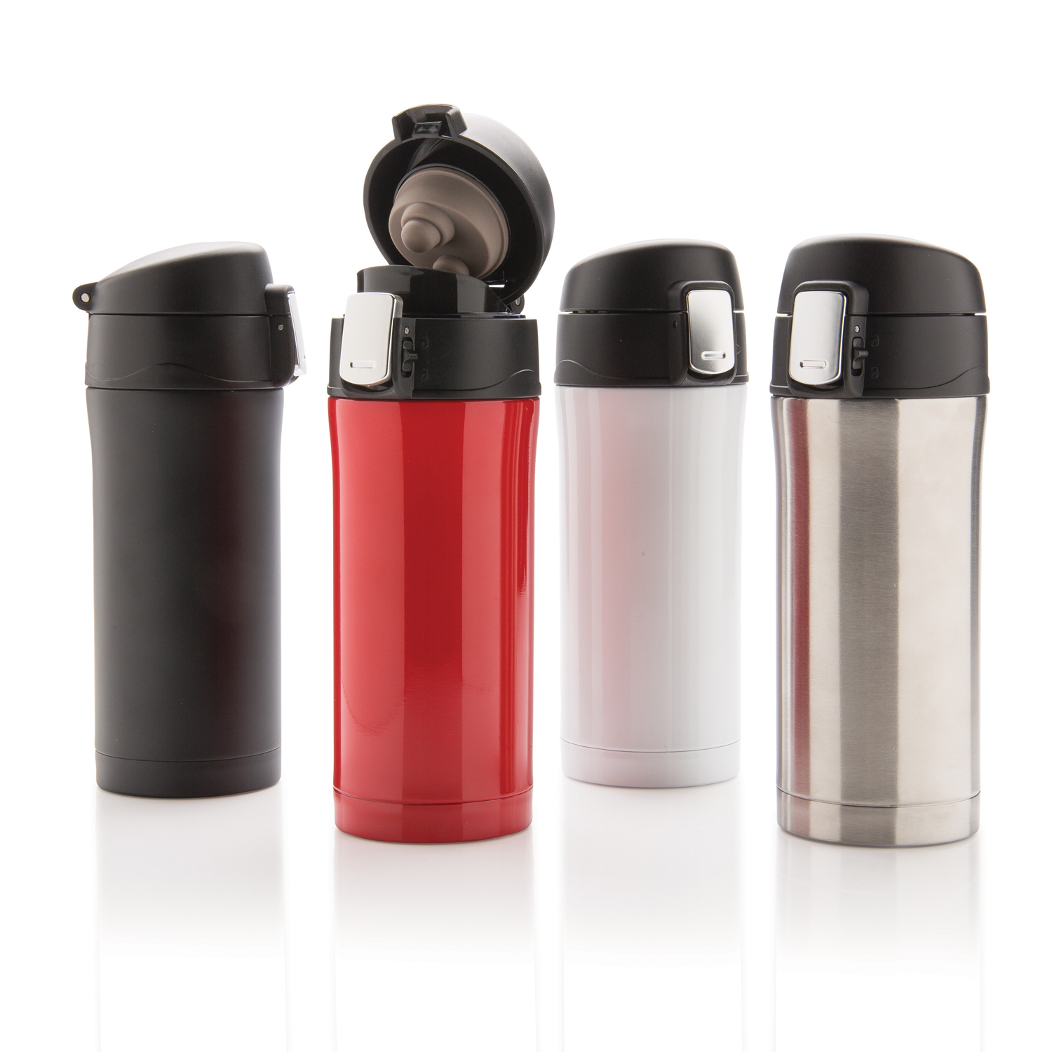 Термокружка Easy lock объемом 300 мл с двойными стенками из нержавеющей стали сохранит температуру горячего чая или кофе до 5  часов и холодного напитка до 15  часов. Запирающаяся крышка полностью устраняет риск протекания или пролива. Крышка легко моется в том числе, в посудомоечной машине. Уникальный дизайн идеально подходит для того, чтобы держать, открывать и закрывать термокружку одной рукой. Размер термокружки подходит для всех автомобильных подстаканников.