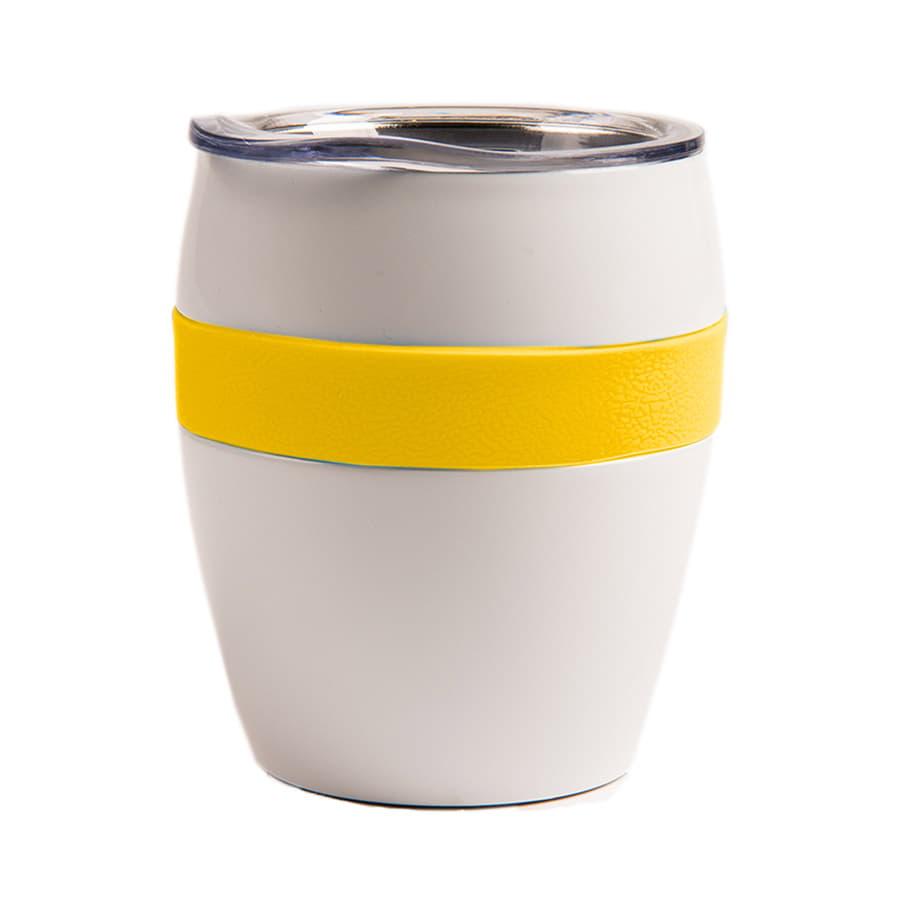Термокружка LINE с двойными стальными стенками сохранит напиток горячим до 3х часов, холодным - до 4х часов. Благодаря форме удачно лежит в руке, и за счет резинового браслета не скользит. Высота без крышки 9,7 см, подходит для большинства кофемашин. -
