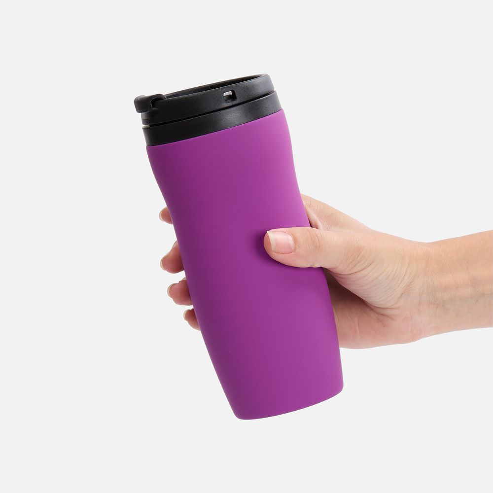 Двухслойная конструкция из нержавеющей стали снаружи и пищевого пластика внутри. Герметичная завинчивающаяся крышка с откидным клапаном для питья. Покрытие софт-тач. В отверстие в крышке можно вставить шнурок для удобного ношения стакана на руке. Шнурок в комплект не входит.