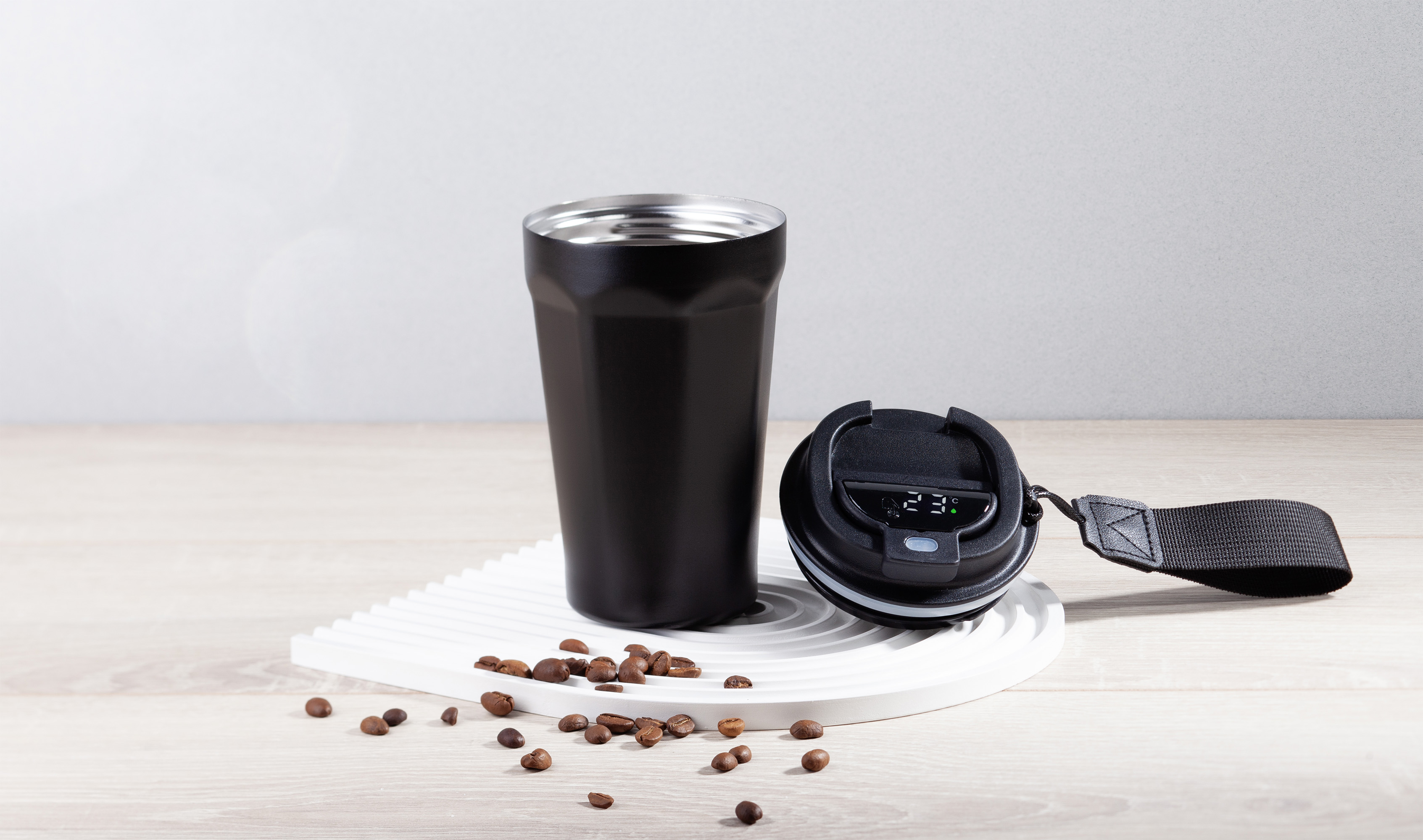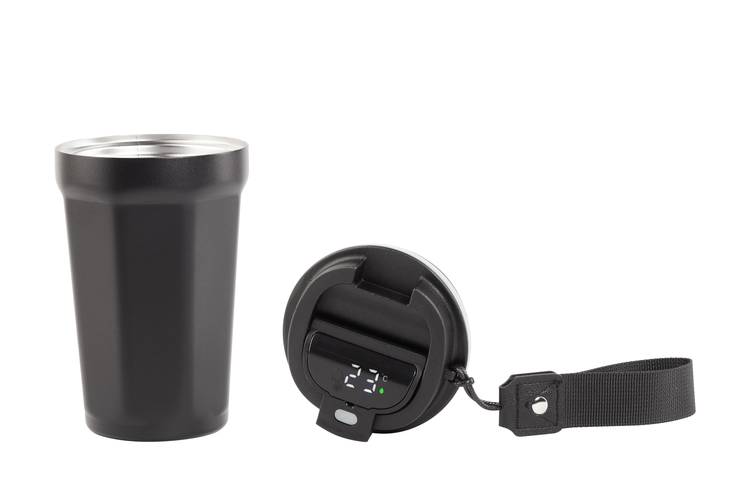Термостакан "Legend" - создан, чтобы стать легендой. Оригинальная граненая форма с выраженными ребрами. Порошковая краска защищает от механических повреждений, сохраняет безупречный вид изделия. Колба из пищевой нержавеющей 316 стали с добавлением молибдена. Встроенная индикация температуры напитка с сенсорным управлением. Крышка получила разборную конструкцию, батарейку (тип  CR2032) легко заменить. В комплекте ручка (длина 7,5 см), оптимально подходит для поездок на самокате/велосипеде. Поставляется в индивидуальной фирменной коробке.