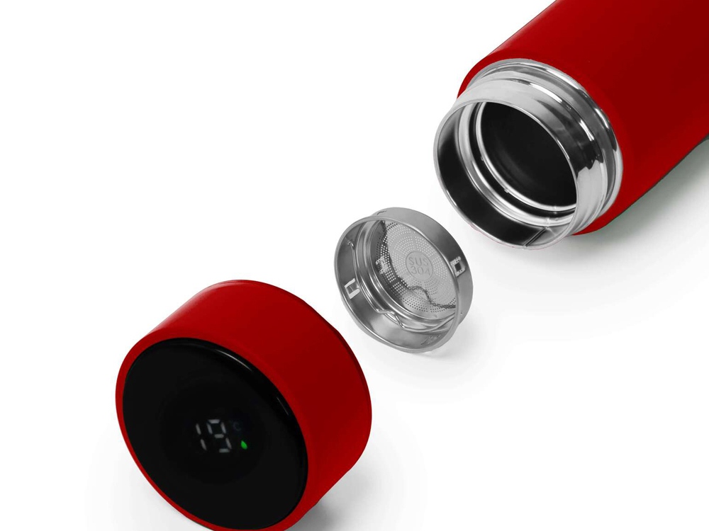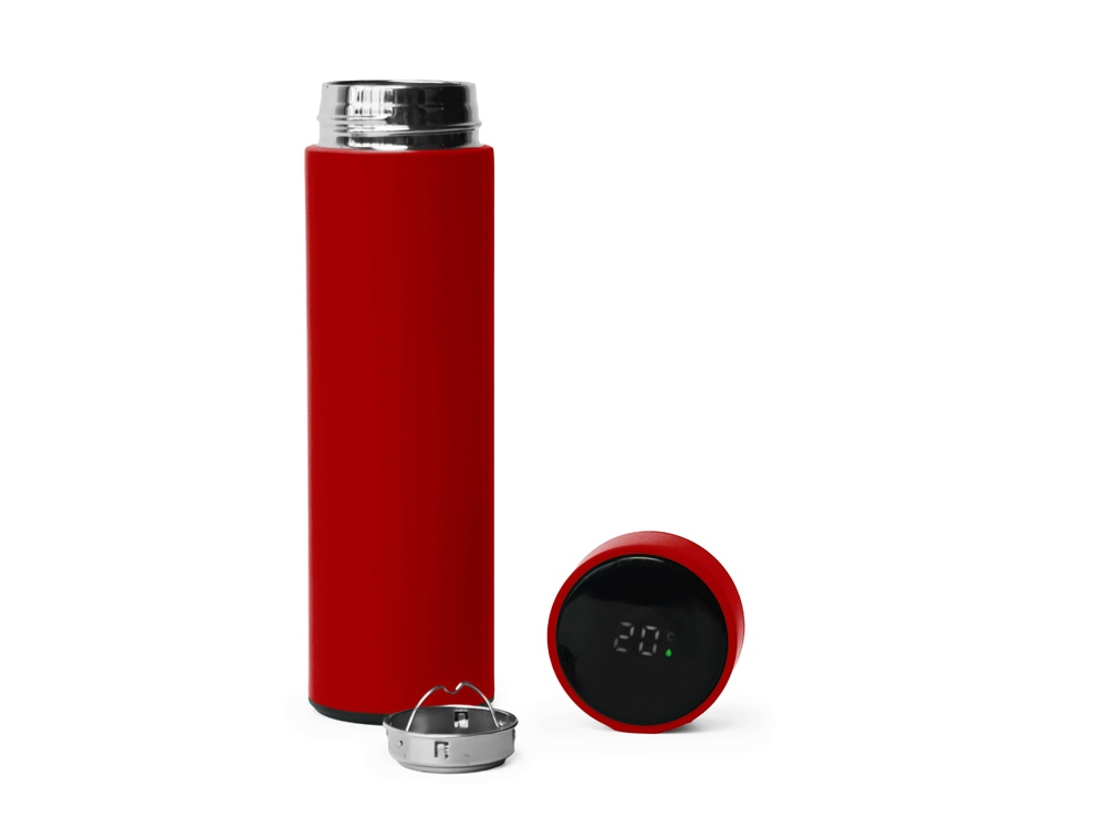 Термос из нержавеющей стали, покрытый цветным soft touch, с крышкой, в которой встроен термометр и LED дисплей, показывающий температуру внутри термоса. Объем: 500 мл. Упаковка: каждый термос в крафт коробке. -