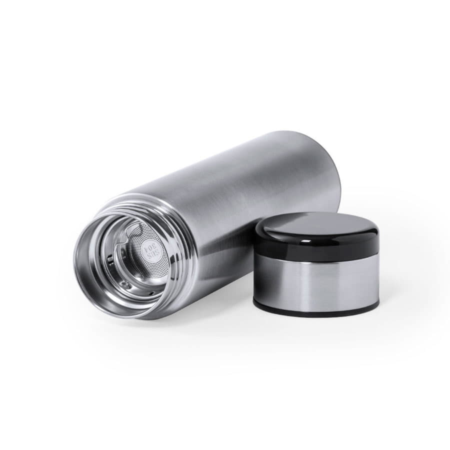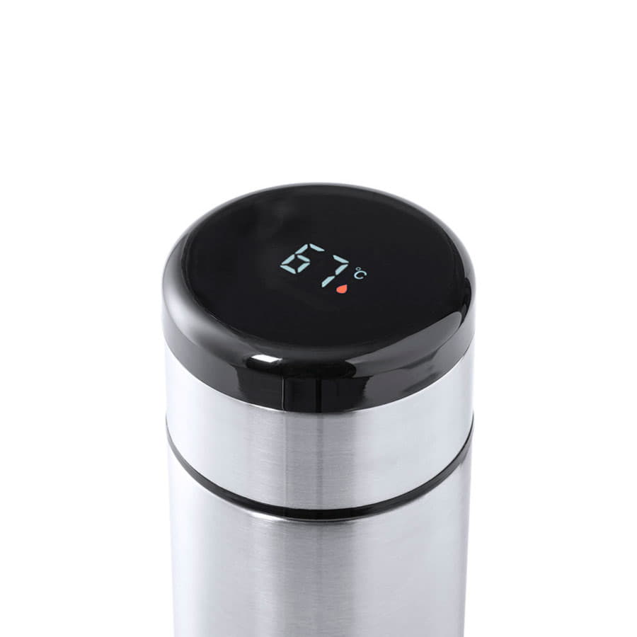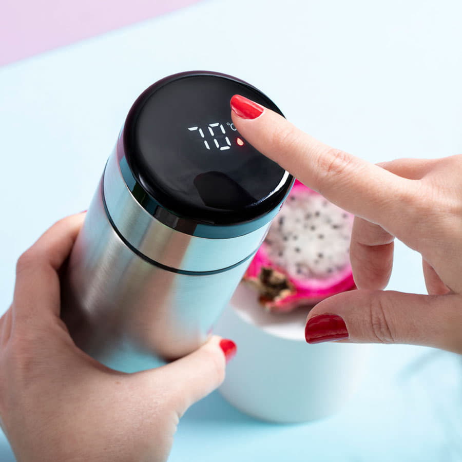 Термос из нержавеющей стали емкостью 420 мл с датчиком температуры и сенсорным экраном, встроенным в крышку. Двойные стенки отлично сохраняют температуру напитка. Термос имеет навинчивающуюся крышку и ситечко. Индивидуальная упаковка - белая картонная коробка с изображением продукта. Батарейка в комплекте. -