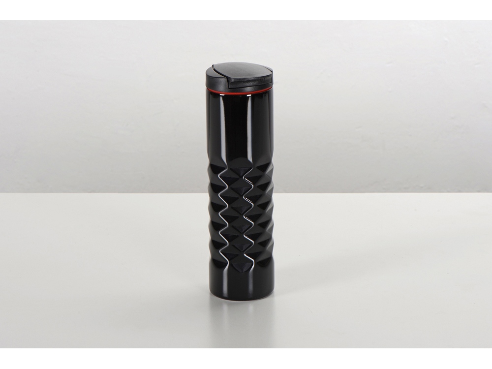 Термос с двойными стенками из нержавеющей стали с вакуумной изоляцией, откидной крышкой и привлекательным дизайном с геометрическими фигурами. Объем – 475 мл.