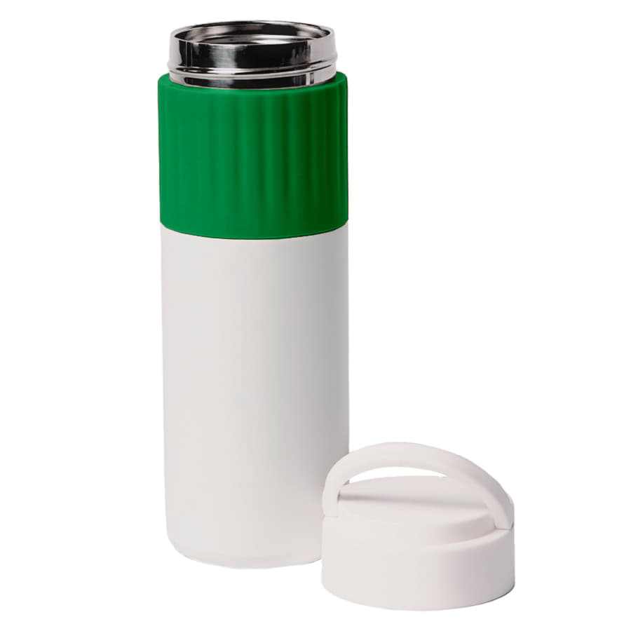 Термос TURBO с двойными стальными стенкамиСтильный белый матовый корпус термоса с цветной силиконовой манжетойДержатель на крышке для удобства переноскиГерметичная навинчивающаяся крышка не даст напитку пролитьсяСохраняет температуру жидкости до 8 часов в зависимости от температуры окружающей среды.Цвет близкий к Pantone 355CИндивидуальная упаковка из крафтового картона -