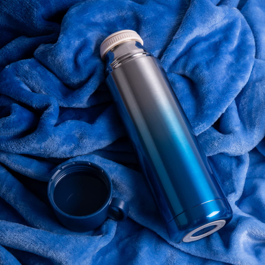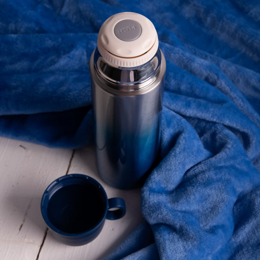 Вакуумный термос Gradient с двойными стальными стенками. Очень удобная форма крышки-чашки. Отделка - плавный градиент из серебряного в насыщенный синий цвет. Сохраняет тепло до 12 часов в зависимости от температуры окружающей среды. -